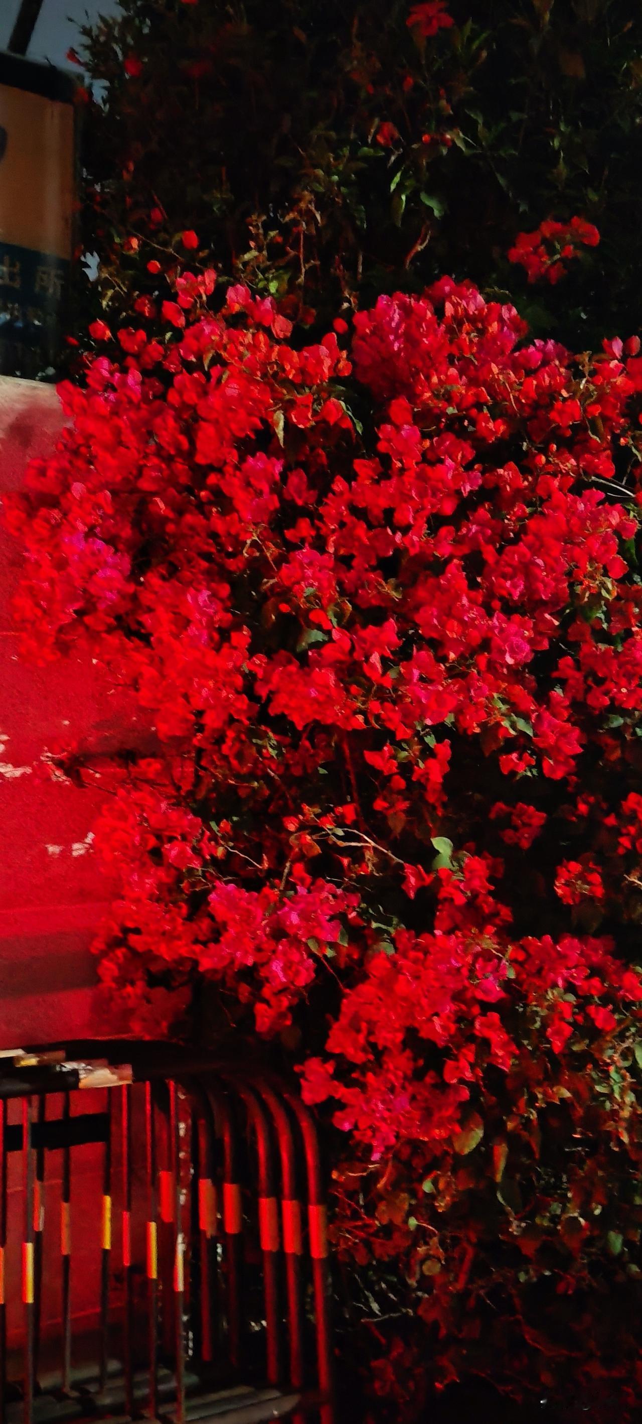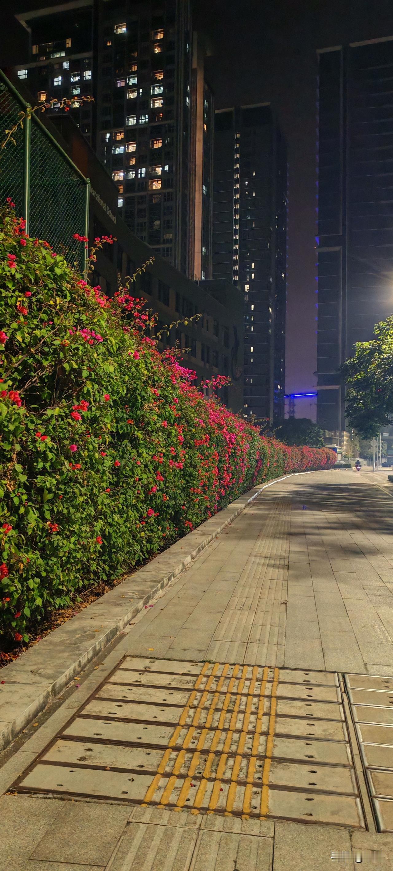 我回来了,我跑步回来了! 晚上10点钟出去的,一口气跑了5000步,当然是没有速度只有动作的跑。 夜晚的温度是16度,穿多了,跑起来就热上了。无论怎么热楞是没有脱掉外套,由于跑的不快,也并没有大汗淋漓,但确实是出汗了,回来内衣还是湿的呢。 和上次一样,沿着南海大道一直往南跑,4千到5千步这段跑到赤湾高架桥去了,有点黑,偶有外卖小哥经过,也有车偶过。周围全部是在建工地。 学佛的人虽然不怕,但下次不跑那里了,我要保证我自己是安全的,因为我还有老妈在惦记我呢。 回来就是边玩儿手机边溜溜达达了,去时5000步跑了40分钟,回来用了80分钟。 回来的路上对面有一堵三角梅花墙,忍不住跑过去自拍了一条视频,又拍了好几张照片。 哈哈,我是拍客,走哪拍哪。