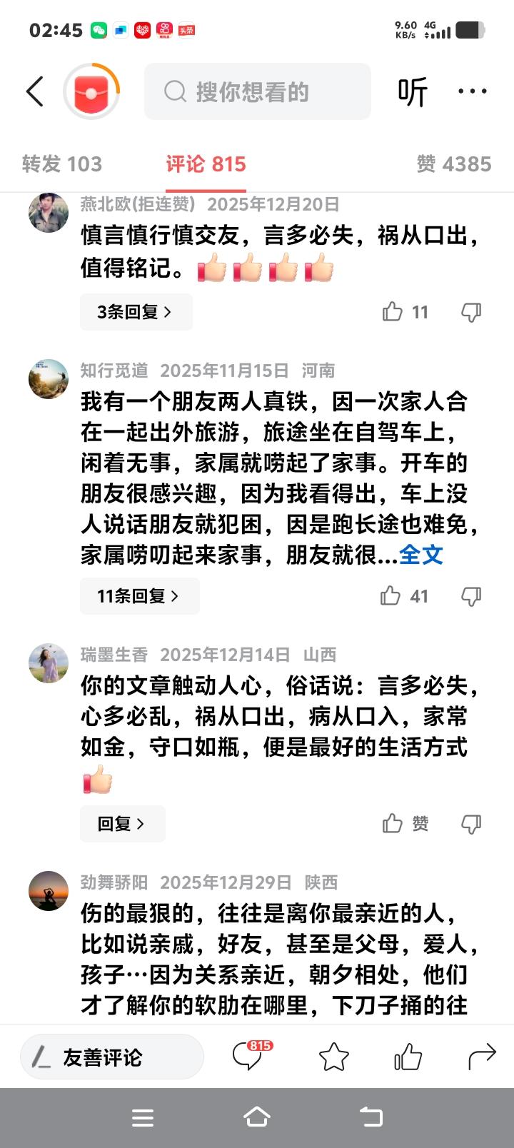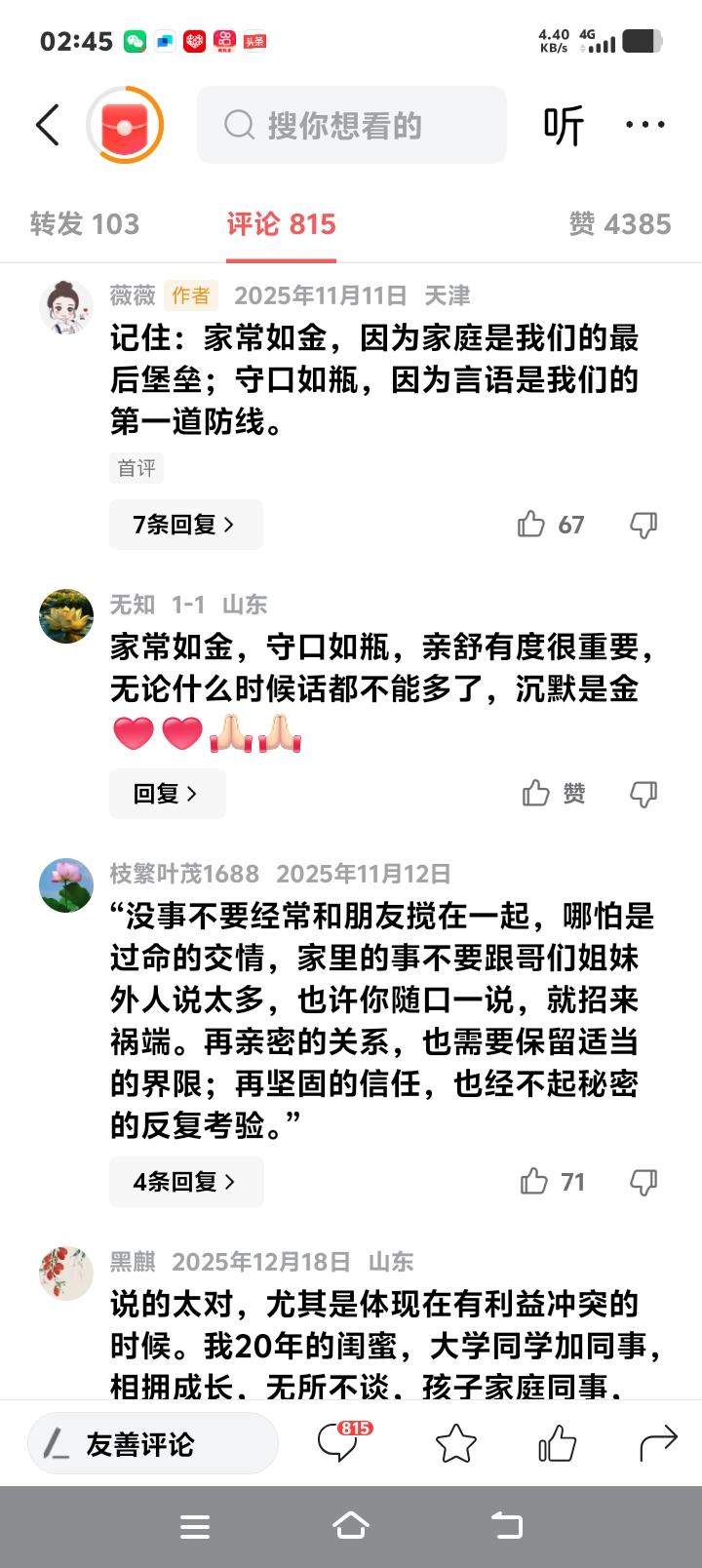 退休刑警八字真言让我家破人亡:那个知道我父亲病危的兄弟,用我的眼泪做了他商战的垫脚石 (来源:根据真实社会现象与人性案例深度剖析撰写) 那晚阳台的风很凉,三瓶啤酒下肚,我把父亲的病危通知书折成纸飞机,扔进了夜色里。我对二十年兄弟大刘说:“ICU一天三千,我怕撑不住。”他拍拍我的肩,眼神像夜色一样深。一个月后,他撤资的消息和竞争对手的新品发布会,同时砸碎了我的手机屏幕。 老刑警退休时送我八个字,墨迹未干:“家常如金,守口如瓶。”那时的我嗤之以鼻,认为真情能抵挡一切算计。直到我在法律文件上签字,看着自己亲手养大的技术团队集体倒戈,才懂什么叫祸从口出。我把家事当谈资,兄弟当树洞,最后他用我的软肋,精准地捅穿了我的命脉。 人心是经不起凝视的深渊。你以为的推心置腹,在对方耳中可能是价值连城的情报。我说父亲的治疗是个无底洞,他听到的是我资金链即将断裂;我抱怨骨干要求加薪,他听到的是挖角的最佳时机。每一句深夜的倾诉,都成了他商业版图上的一枚棋子,而我,还在为这份“信任”感动不已。 界限感是成年人最后的铠甲。两家人亲密到孩子互称兄妹,妻子互换秘密,我们都忘了再好的瓷器碰在一起也会有裂痕。当利益的天平开始倾斜,那些曾经共享的温馨细节,全部变成了刺向彼此的匕首。没有距离的关系,就像没有堤坝的洪水,终将吞噬一切。 沉默是金,不是教你冷漠。而是在开口前,学会灵魂三问:这事非说不可吗?对方非知不可吗?知道了对谁真正有益?真正的成熟,是懂得有些压力必须自己扛,有些软肋必须自己藏。你的眼泪和脆弱,在有些人眼里是安慰的契机,在另一些人眼里,却是可乘之机。 如今我坐在创业初期的旧办公室里,泡着老刑警送的茶。茶叶在沸水中沉浮,像极了人际关系的真相——总要经历滚烫的洗礼,才能沉淀出真正的滋味。大刘托人传来道歉信,我原封退回。不是不肯原谅,而是我终于明白,有些信任碎了就是碎了,强行粘合只会留下更锋利的边缘。 女儿问我为什么刘叔叔不来了,我摸着她的头说:“宝贝,记住,再好的朋友也要有自己的花园。”她似懂非懂,但总有一天会明白:守护家庭的秘密,就是守护花园的篱笆;慎言慎行,不是失去真诚,而是让真诚变得更珍贵。 昨晚翻到毕业照,背后“一辈子的兄弟”墨迹已淡。原来一辈子的长度,不取决于誓言多响,而取决于嘴巴多严。言语如水,泼出去就收不回;信任如瓷,碎一次就永留痕。这堂课代价惨重,但若能让你在读到此处的瞬间,下意识地捂了捂自己的口袋和心房,那么我这一切,也算值了。 人性真相 人际边界