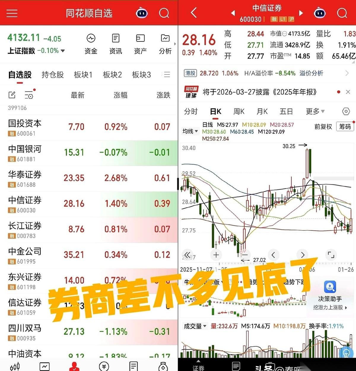 都盯着有色金属那边狂欢,但真正的牌桌,可能已经悄悄挪到了券商这边。 特别是那些名字里带“国”字头的大家伙,平时一动不动,像块压舱石。 突然,中信证券的业绩快报甩了出来,净赚三百亿。利润增速把市盈率甩开好几条街,股价却还趴在地上。 这就像一个肌肉壮汉,穿着一件根本不合身的紧身衣,浑身都是劲,就是没法舒展。 现在,两个信号出现了:成交量起来了,涨停板也冒头了。 想象一下,那些在别的板块赚得盆满钵满的热钱,正捏着一大把现金,眼珠子四处乱转,寻找下一个价值洼地。而这些业绩扎实、有国家背景的传统券商,就像一个敞开大门、还没人哄抢的金库。 这就是一场新旧资金的心理战。 新手冲进来,享受的是牛市初期的“新手福利”,闭着眼都能捞一笔。 但真正残酷的是下半场。行情不会永远上涨,当潮水退去的时候,只有那些老手才知道哪个浪头是送钱的,哪个浪头是来收命的。 所以,这到底是给老鸟们准备的年底红包,还是又一轮割新韭菜的开场哨声?