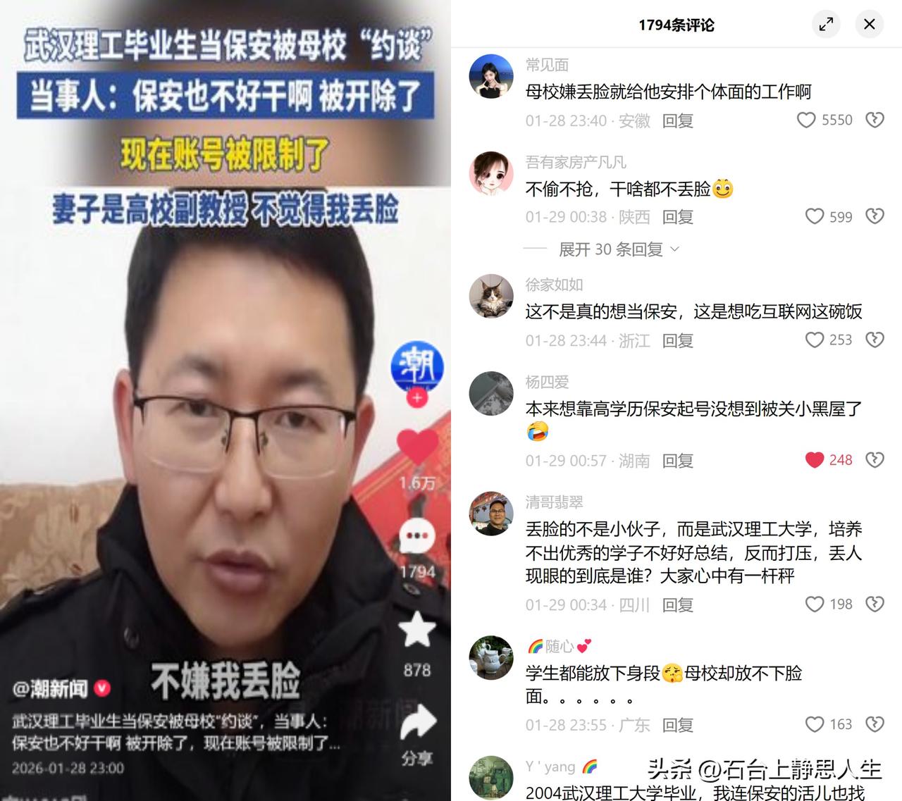 41岁名校生当保安,账号受限。 农村出来的他是村里头一个重点大学生,如今干着月薪3800的保安活,拍视频只是想分享真实状态帮人避坑,没想到先引来了母校的关注,后来账号还被限了。网上吵成两派,有人说他蹭母校流量炒作,有人替他鸣不平。 这事儿看着荒唐,倒也揭开了俩藏在台面下的规矩。一是社会对名校生的绑架:读了名牌大学,就必须顺着高薪体面的剧本走,要是选了普通人的路,就是浪费资源、丢学校的脸。二是平台规则的僵化:把不带滤镜的生存真实,直接归到卖惨营销里,容不下反差里的真心。 农村出来的孩子,哪有那么多逆袭的爽文?多数人不过是凭力气吃饭,挣一份踏实钱。职业本无贵贱,可惜不少人眼里只认标配人生的标签。 到底是谁,容不下这份真实?