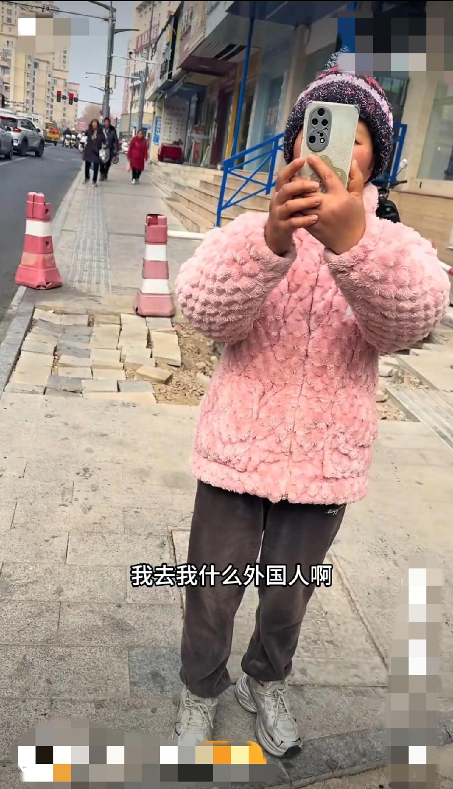 浙江台州一广告公司员工因业务需要,在现场测量拍摄客户门头。可能因为长得像歪果仁(