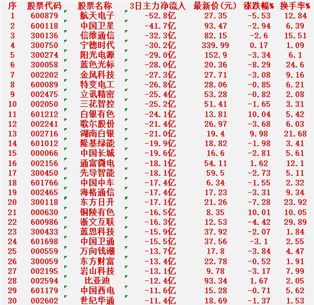 当心!1月29日,前3天主力大幅卖出的30名单 航天电子:净流入 -52.8亿元,跌幅 -5.53% 中国卫星:净流入 -41.7亿元,跌幅 -2.94% 信维通信:净流入 -32.3亿元,跌幅 -2.60% 宁德时代:净流入 -30.2亿元,涨幅 +0.17% 阳光电源:净流入 -29.0亿元,跌幅 -3.34% 蓝色光标:净流入 -28.0亿元,跌幅 -8.29% 金风科技:净流入 -27.3亿元,跌幅 -3.08% 特变电工:净流入 -26.8亿元,跌幅 -0.85% 立讯精密:净流入 -25.4亿元,跌幅 -0.82% 三花智控:净流入 -25.2亿元,跌幅 -1.65%