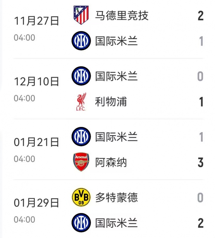 但下半程对阵马竞、利物浦、阿森纳和多特时,国米只赢下了最后一轮对多特的比赛,其余三场则是全败,此外国米对阵马竞和利物浦都是被对手绝杀。