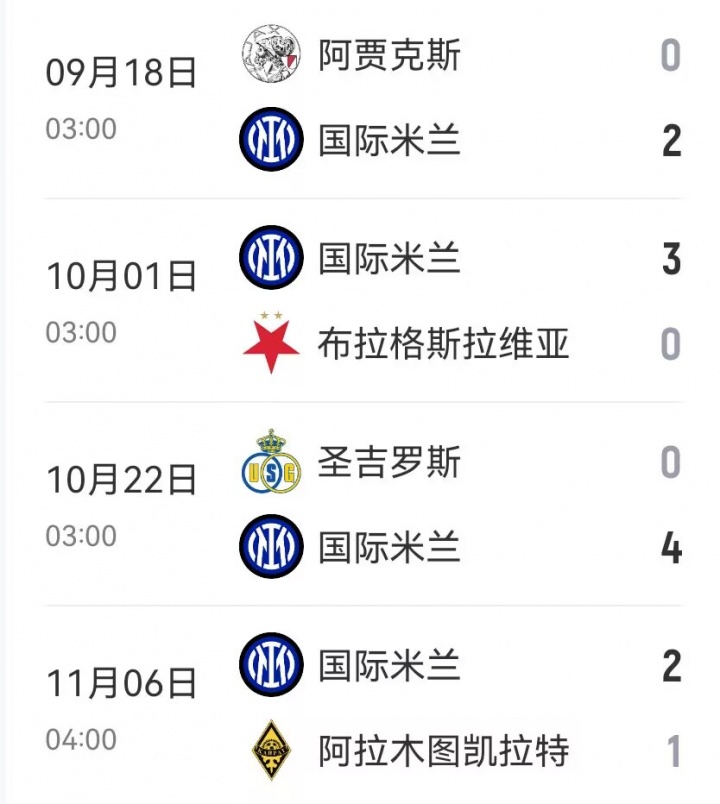 国米欧冠联赛阶段后4场战绩↓
