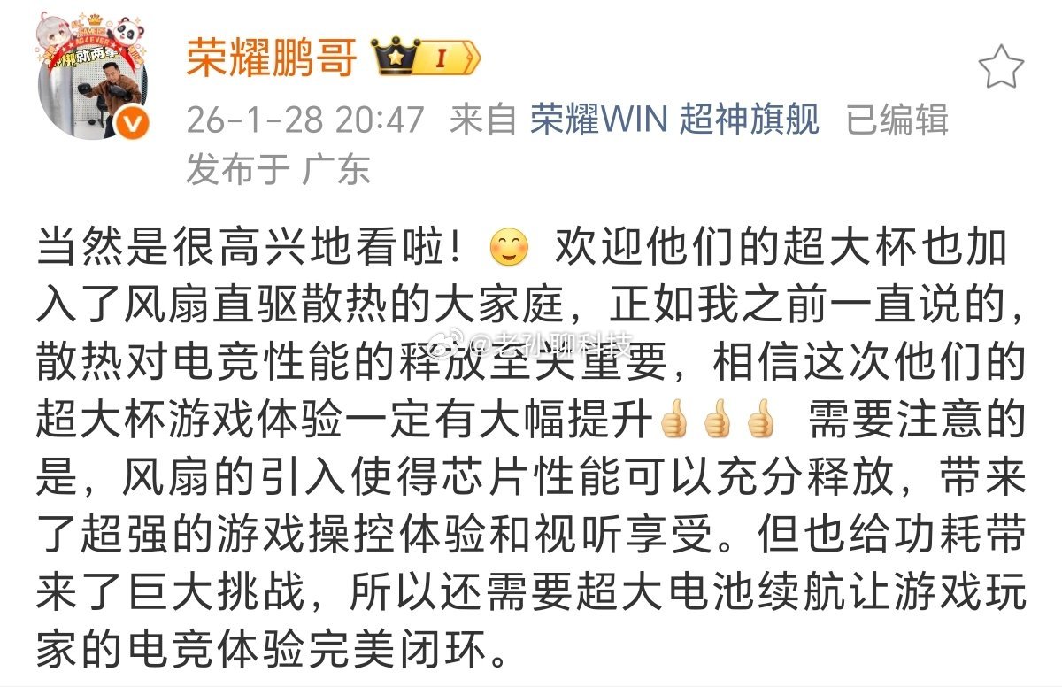 荣耀WIN系列内置主动散热风扇,目前来看比较受欢迎,效果也不错,友商也都看到了成功iQOO 15 Ultra支持主动散热风扇,荣耀鹏哥表示欢迎,还认为有声的性能释放一定也很棒这才是良性竞争,好的技术大家一起用,而不是调侃我的技术好,友商用了一定差不止iQOO,接下来更多友商也会用主动散热风扇,这是未来行业的大势所趋