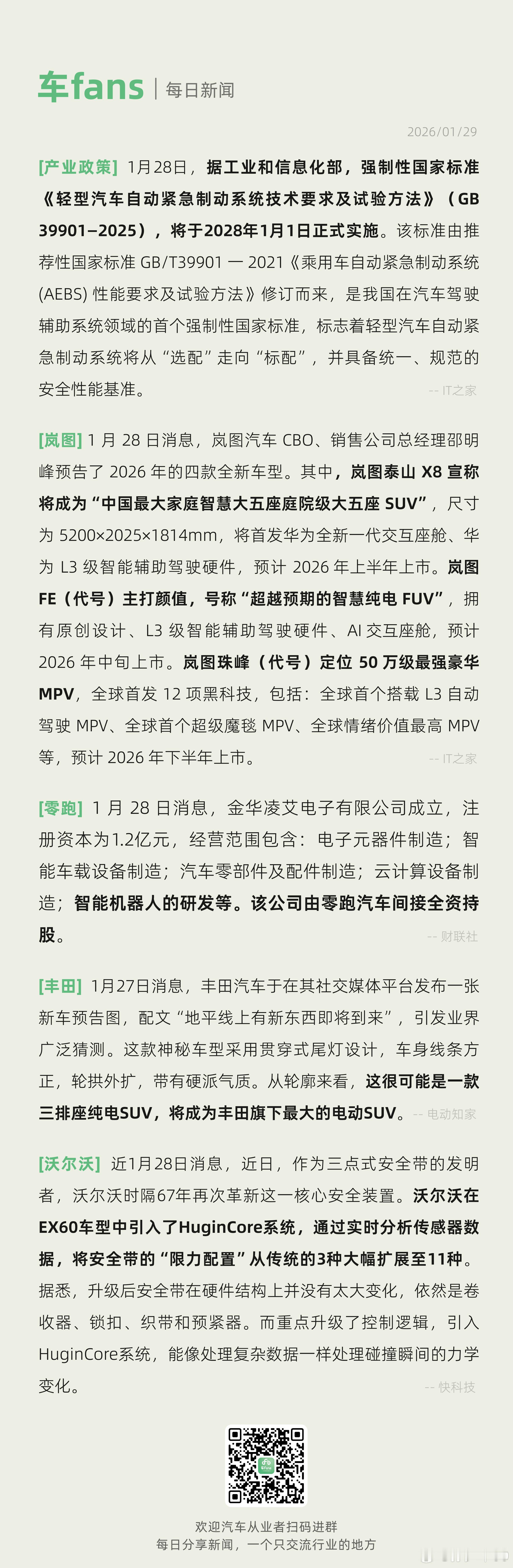 汽车自动紧急制动系统走向“标配”、,岚图总经理邵明峰预告四款全新车型,岚图汽车CBO、销售公司总经理邵明峰预告了2026年的四款全新车型。其中,岚图泰山X8宣称:将成为“中国最大家庭智慧大五座庭院级大五座SUV”,尺寸为5200x2025x1814mm,将首发华为全新一代交互座舱、华为L3级智能辅助驾驶硬件,预计2026年上半年上市。岚图FE(代号)主打颜值,号称“超越预期的智慧纯电FUV”,拥有原创设计、L3级智能辅助驾驶硬件、AI交互座舱,预计2026年中旬上市。岚图珠峰(代号)定位50万级最强豪华MPV,全球首发12项黑科技,包括:全球首个搭载L3自动驾驶MPV、全球首个超级魔毯MPV、全球情绪价值最高MPV等,预计2026年下半年上市。今年新车真多啊新能源汽车