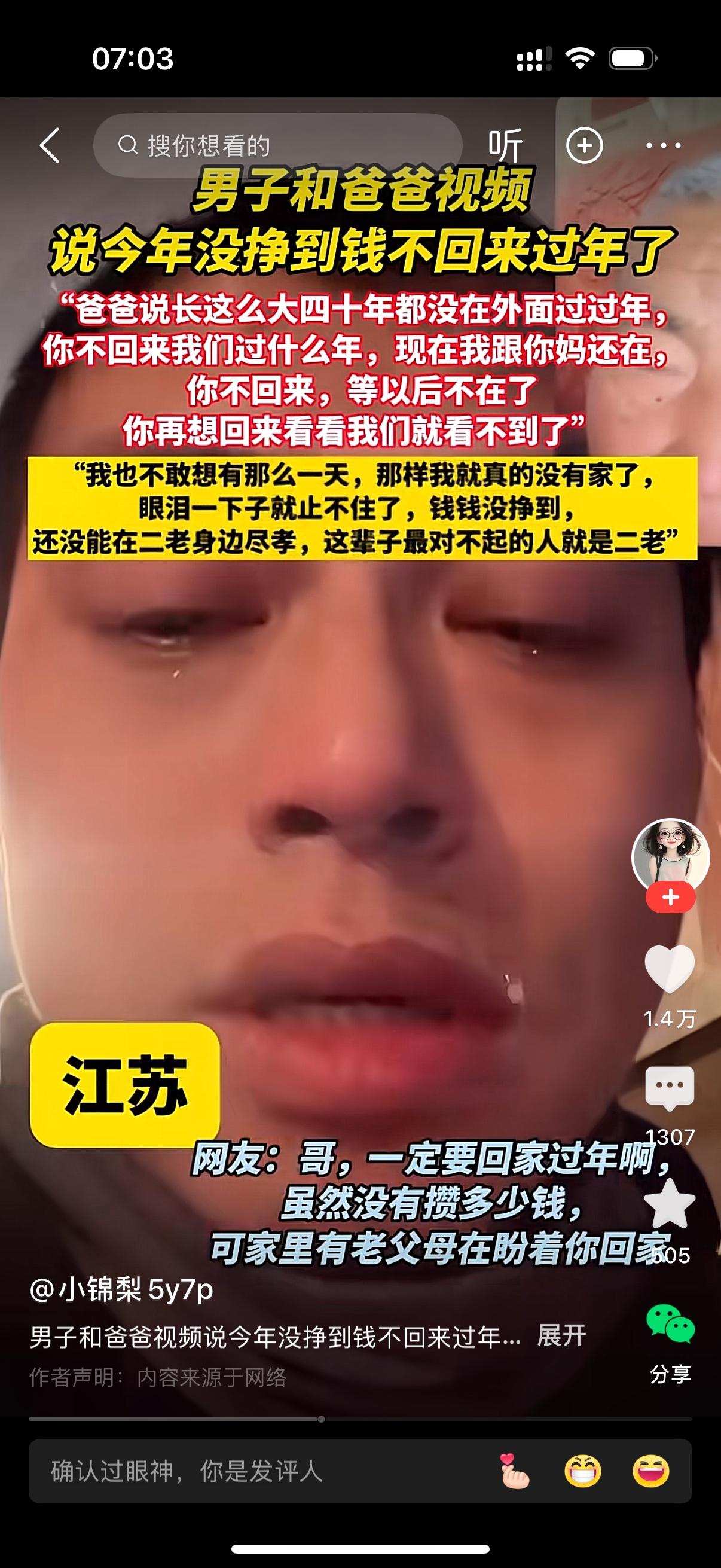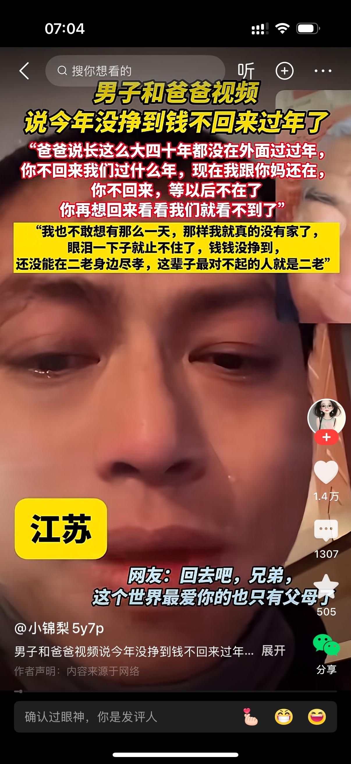 男子和爸爸视频,说今年没挣到钱不回家过年了。爸爸说,长这么大四十年都没在外面过过年。你不回来,我和你妈过什么年。现在我和你妈还在,你不回来,等以后不在了,你再想回来看看我们就看不到了。男子泪如雨下,我也不敢想有那么一天,那样我就真的没有家了。钱没挣到,还不能在二老身边尽孝,这辈子最对不起的人就是你们二老了。