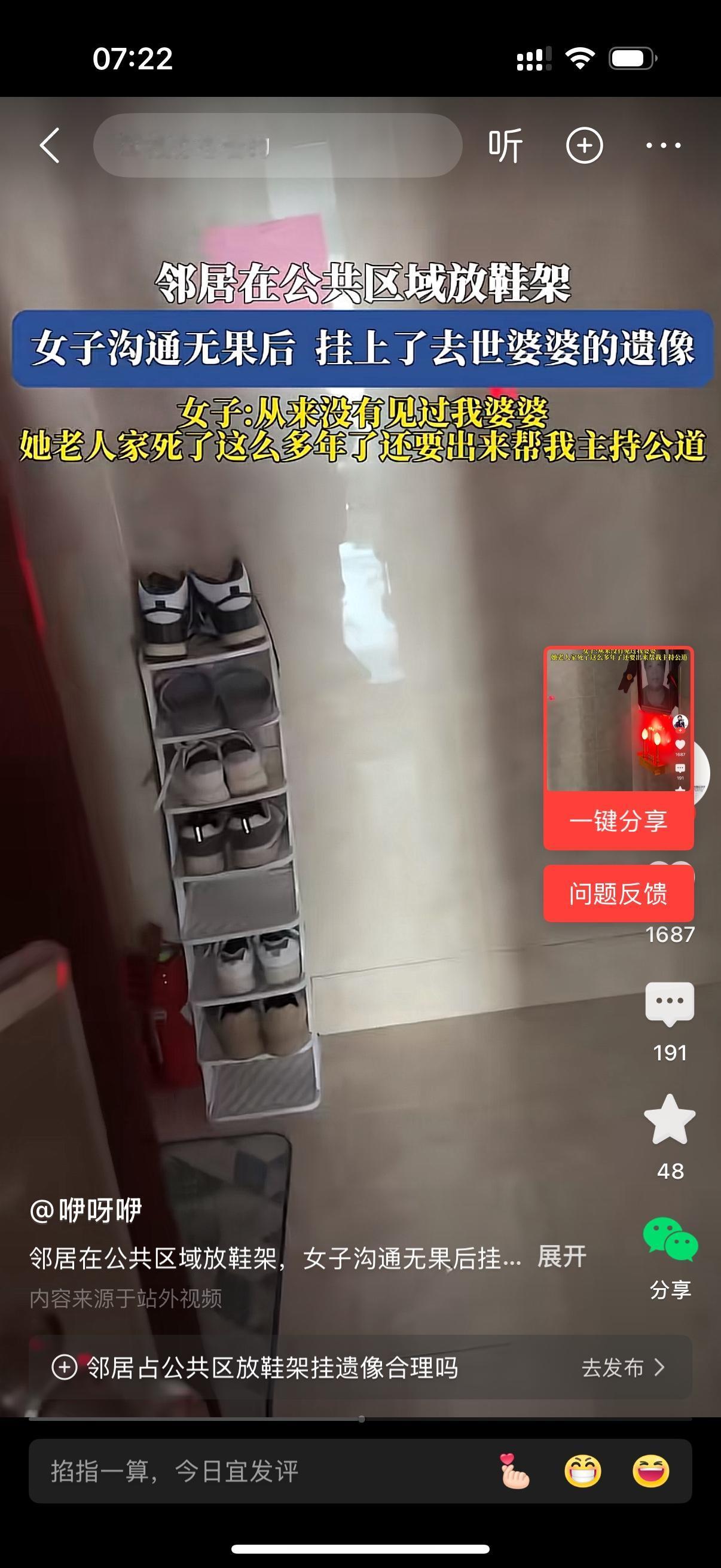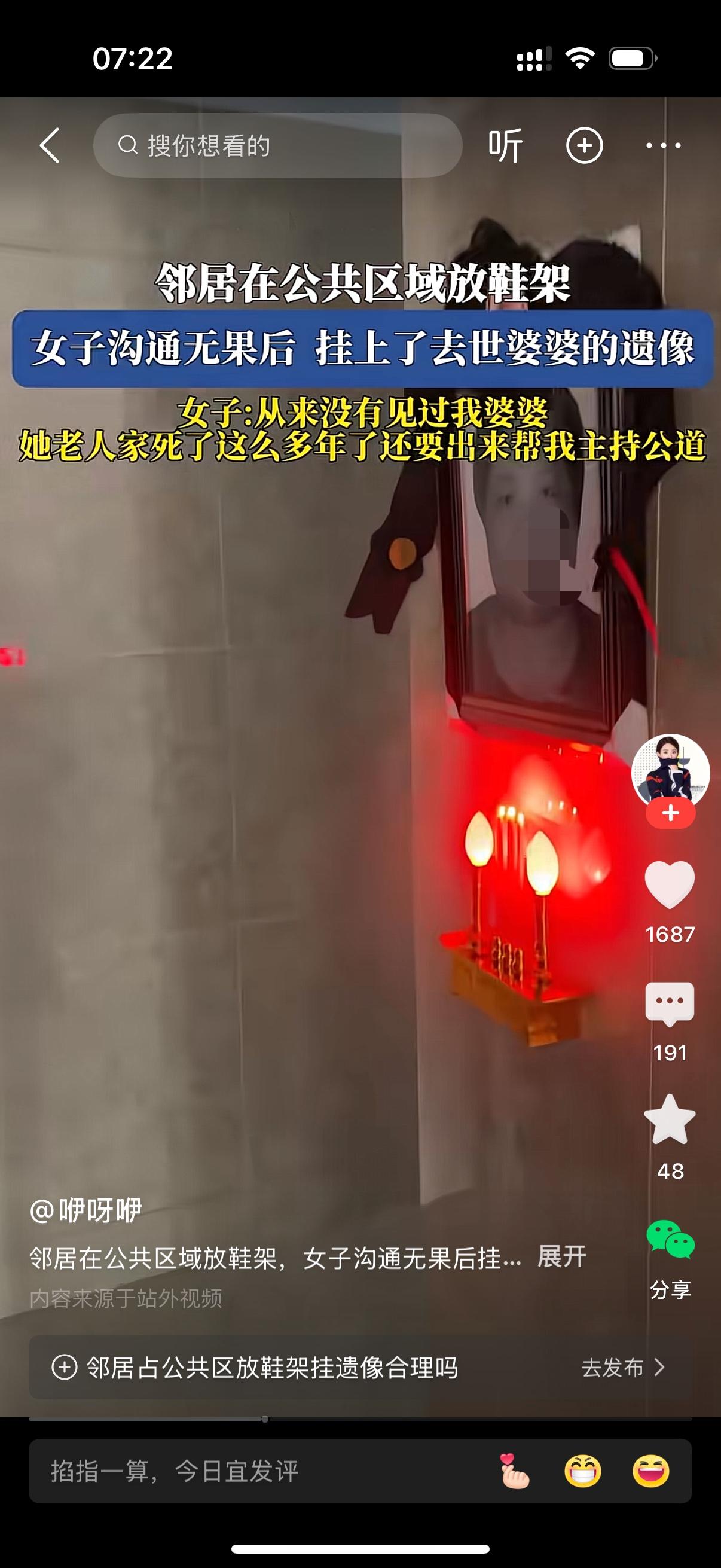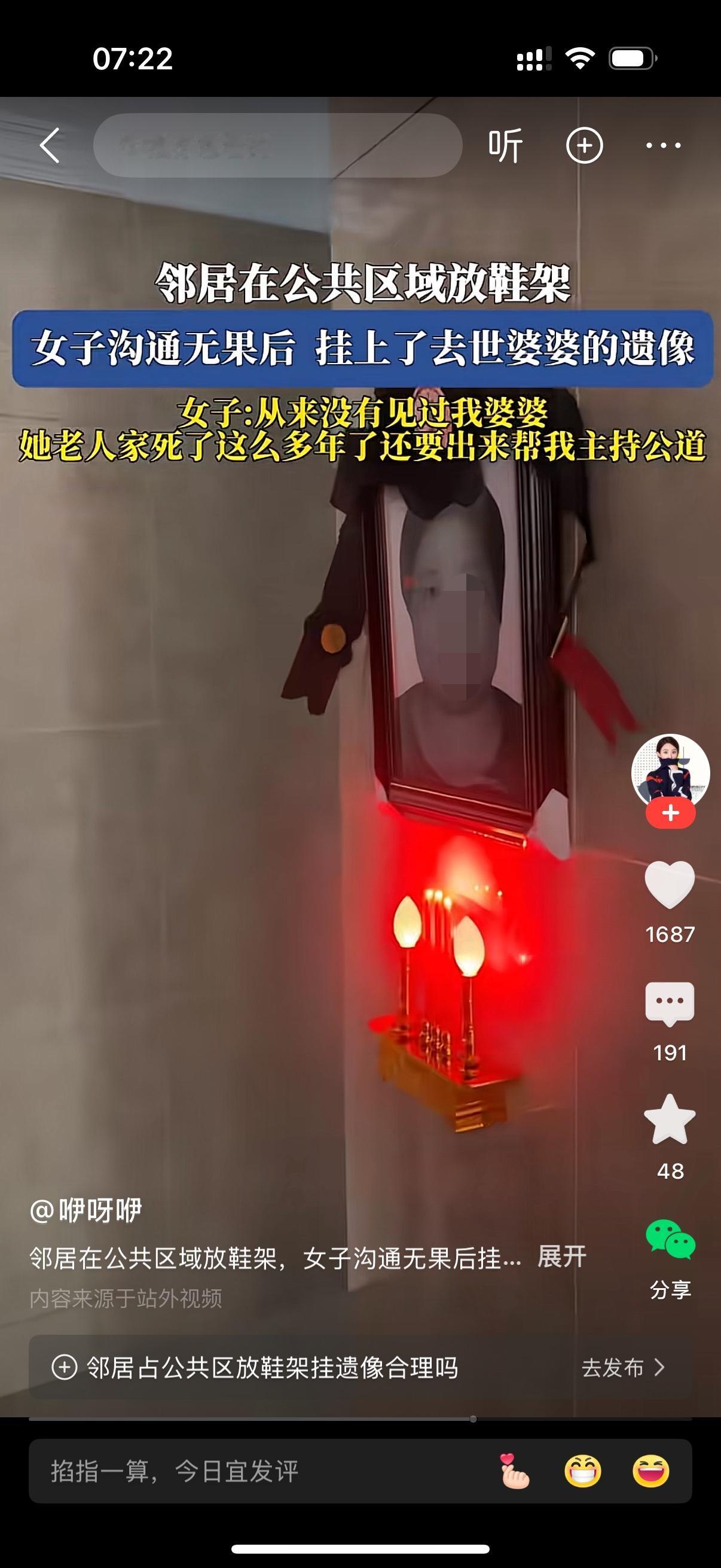 邻居在公共区域放鞋架。女子沟通无果之后,挂上已故婆婆的遗像正对邻居的大门。女子说,从来没有见过婆婆,没想到死了这么多年还要出来替自己主持公道。这个邻居在门口放鞋架没什么问题,这个女人用死人来欺负活人有点过分了。