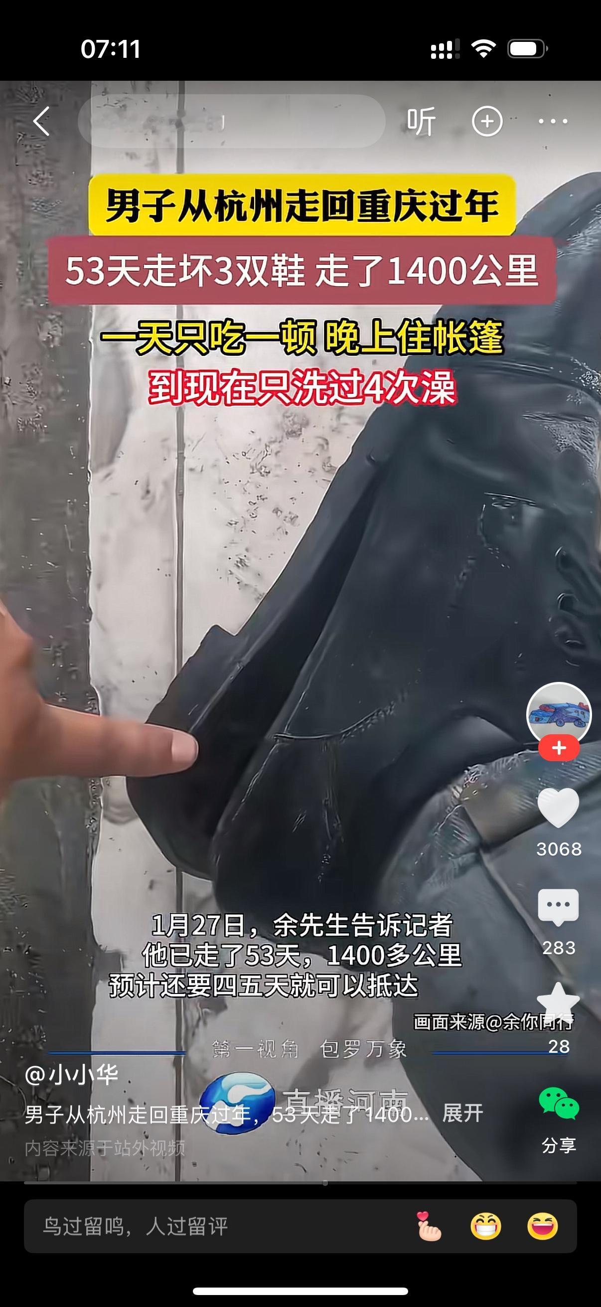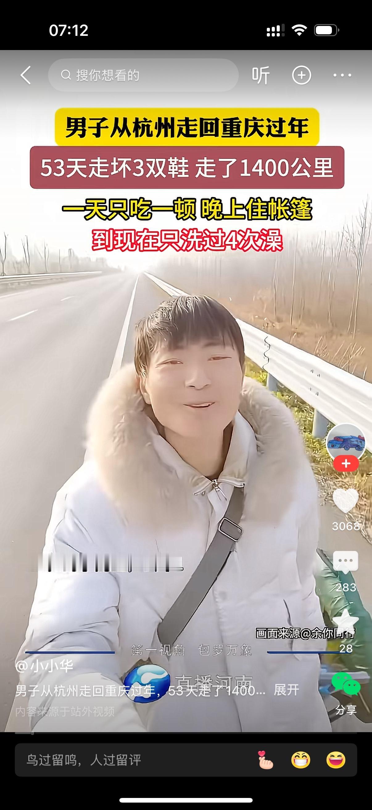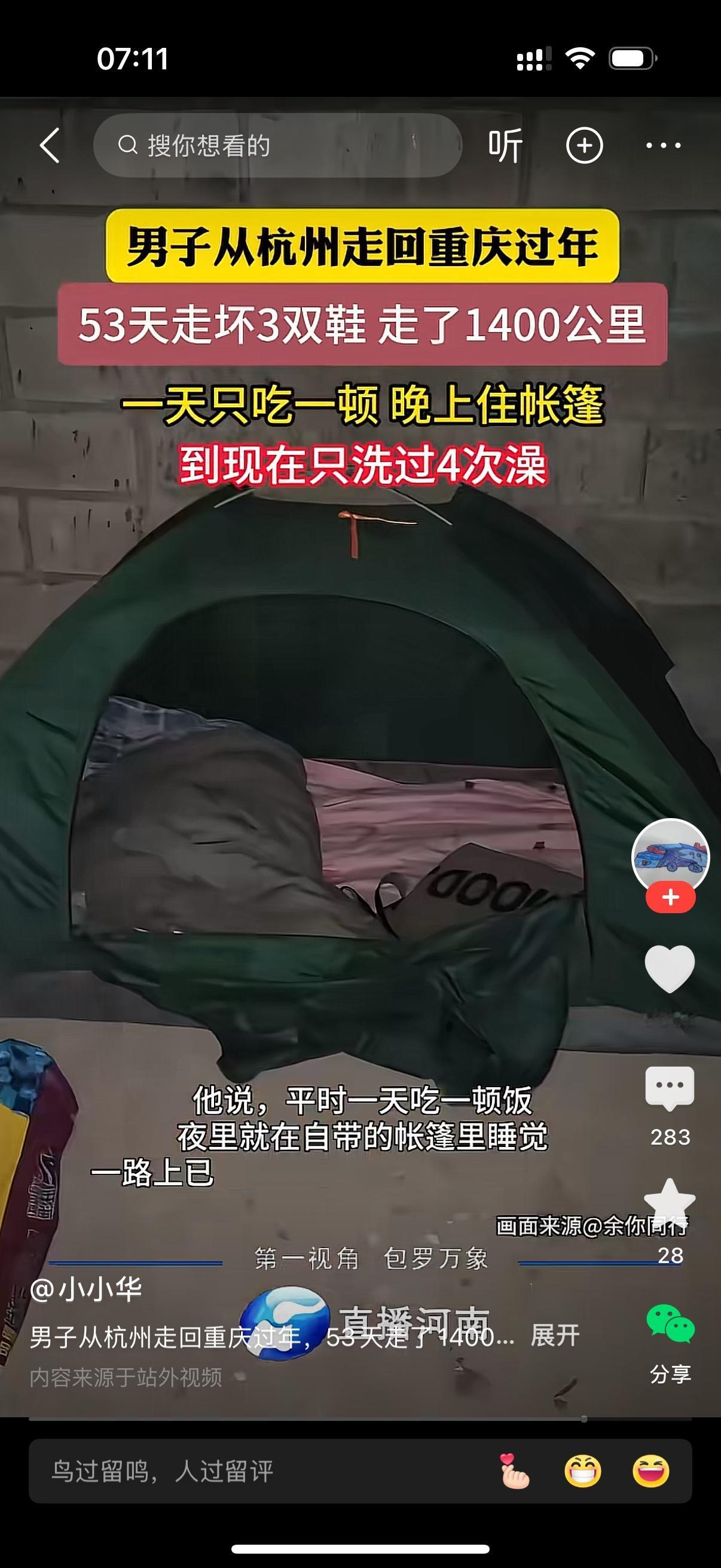 男子从杭州走回重庆过年,他53天走坏了3双鞋,走了1400公里。男子说他每天只吃一顿饭,夜里就在自带的帐篷里睡觉。这53天他就洗过4次澡。这就是没苦硬吃的行为,也不知道是为了真正体验生活还是博取流量或是确实没钱买车票?