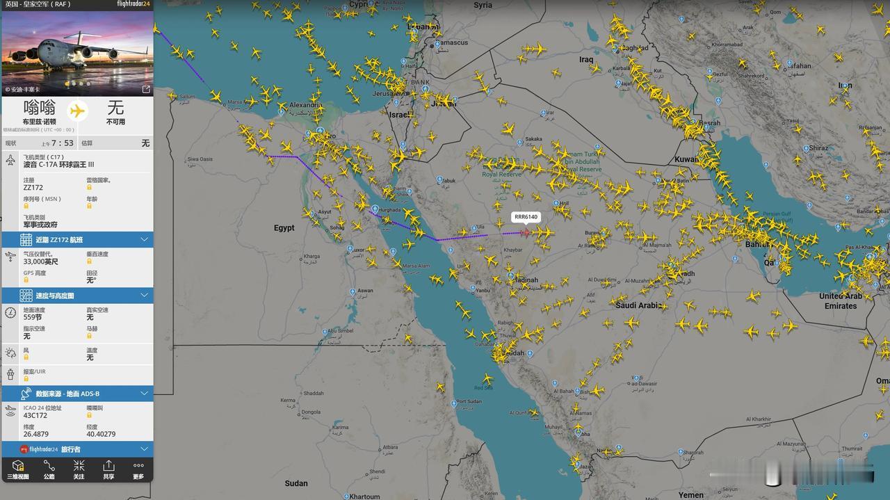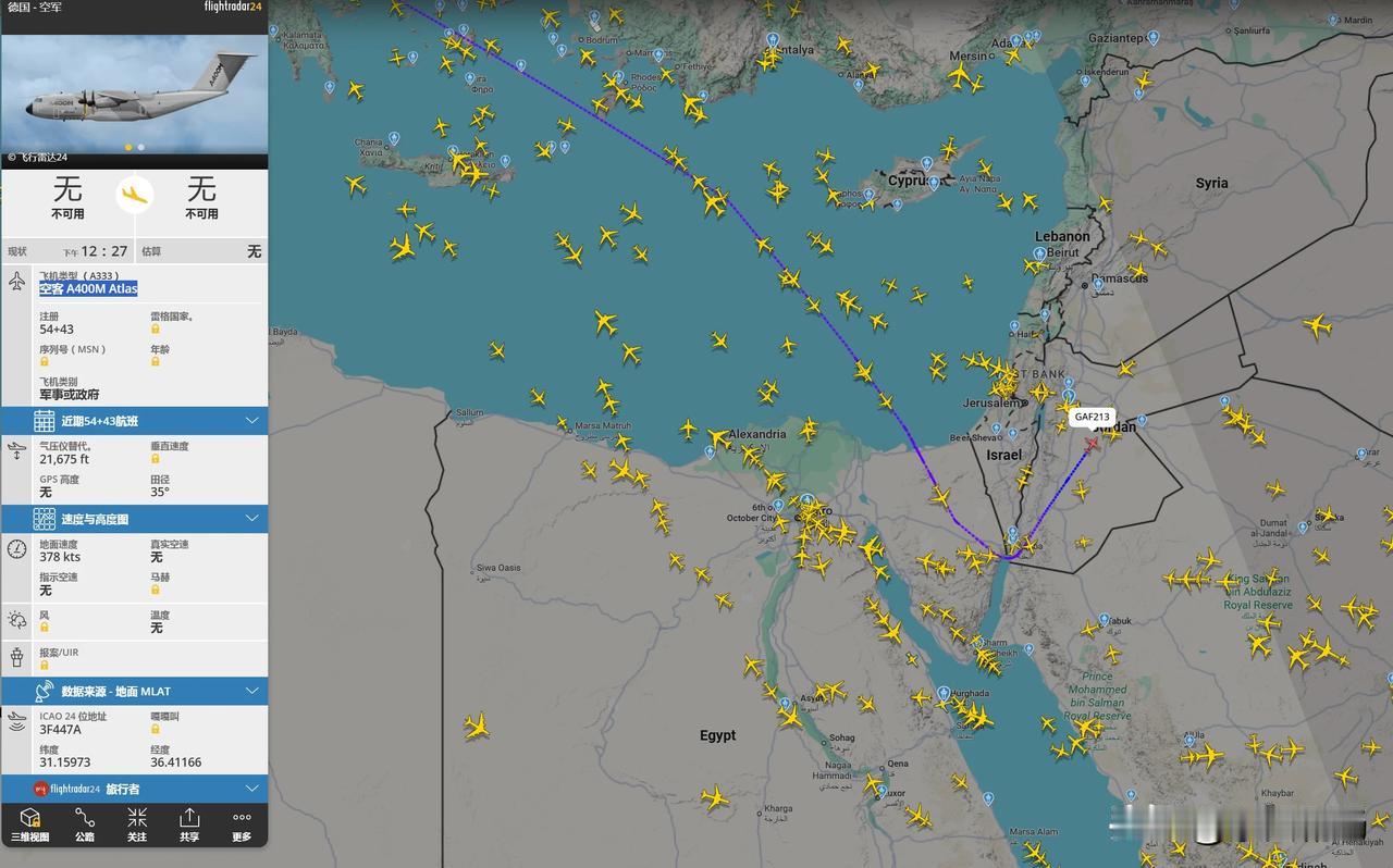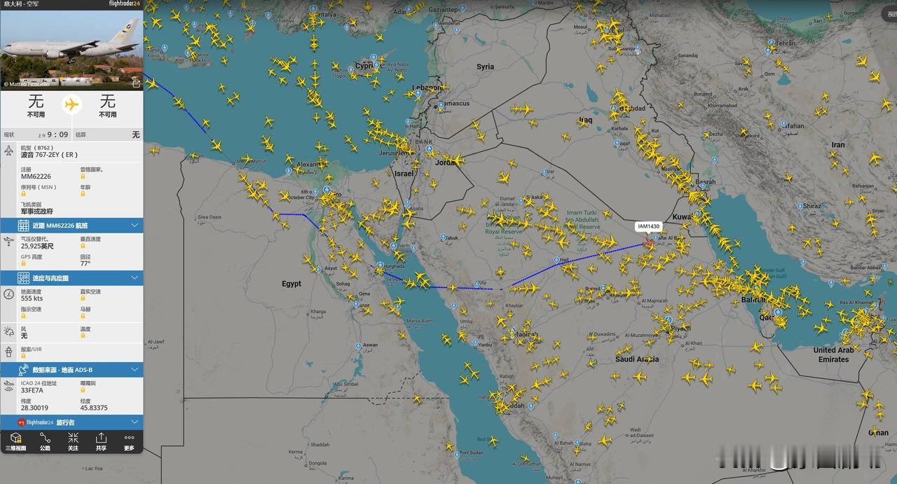 德国空军的一架军用运输机,即将降落约旦美军基地。(图一) 英国和意大利空军的运输机,正在中东空域飞行。(图二三)