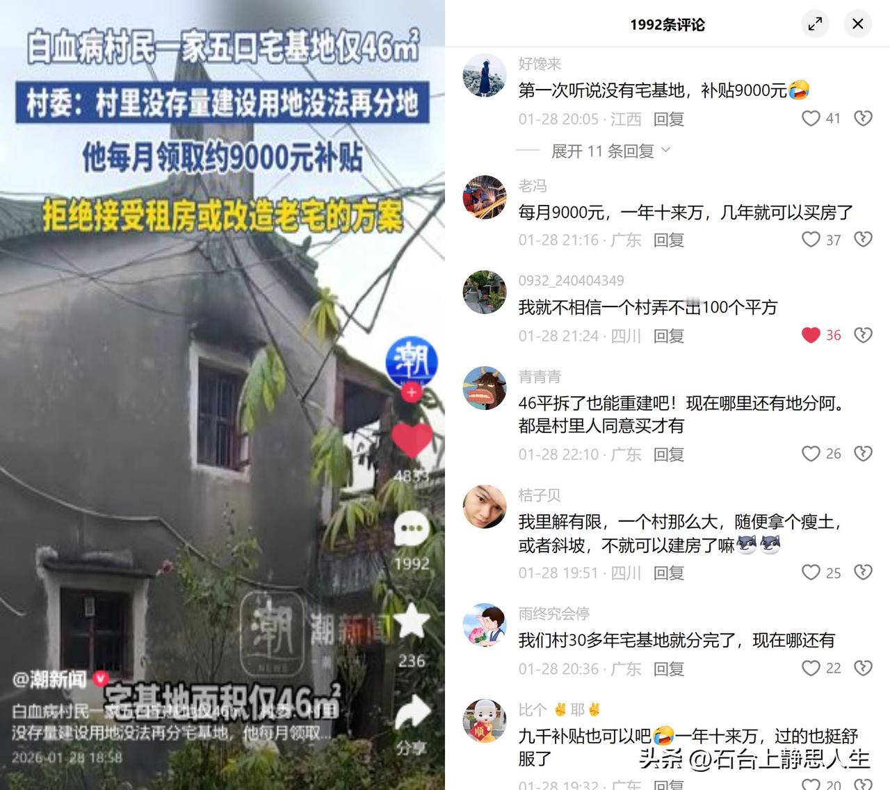 46㎡宅基地PK9000月补 最近汕头这事儿吵得凶,一家五口住着46平的老宅基地,申请新宅基地被拒,相关单位说没地,给了租房或改造的方案,还提了当事人每月有9000元补贴。结果大家大多骂当事人贪得无厌,说有这补贴早能买房了。 但这事儿不能只看表面。查了广东的规定,汕头平原区农村宅基地法定标准是每户不超80平,这也是户有所居的底线参照。46平连这个标准的六成都不到,明显没达到基本居住保障线。 相关单位拿补贴和替代方案应付,本质是把钱的补偿和法定居住权保障画了等号。农村宅基地不仅仅是单纯的房子,更是农民安身立命的根本,租房没归属感,改造46平也没法满足五口之家的基本需求。大家只盯着9000元的数字,却忽略了最核心的规则问题。 说白了,这不仅仅是个人贪不贪的问题,关键在于基层执行的时候,有没有把法定的保障落到实处。