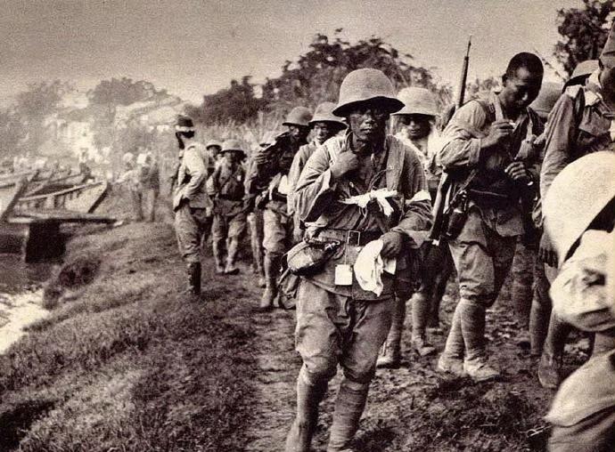 这张照片拍摄于1937年,展现了日军在华南地区水陆兼程、逼近广东潮州的行军画面。照片里的日军士兵装备齐全,正沿着河岸的泥泞小路行进,背景中还能看到临时搭建的军用便桥,反映出当时日军推进的急迫状态。 这是日本侵华战争的直接影像证据,直观呈现了日军的侵略行径,也侧面印证了当时潮州等华南地区所面临的战争威胁。