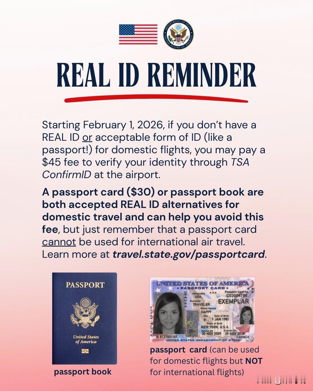 从 2026 年 2 月 1 日开始,如果您乘坐美国国内航班时没有 REAL ID 或可接受的身份证明(例如护照),则可能需要支付 45 美元的费用才能通过 TSA ConfirmID 验证您的身份。 REAL ID 规定概述 生效日期:虽然 REAL ID 法案本身的要求已于 2025 年 5 月 7 日全面生效,要求使用符合规定的证件进入联邦设施和乘坐国内航班,但 TSA 对未持证件旅客收取 45 美元身份验证费用的规定将于 2026 年 2 月 1 日开始实施。 可接受的替代证件:除了符合 REAL ID 标准的驾照或州身份证(标有星标)之外,其他联邦批准的身份证明形式,例如 美国护照簿或护照卡、军人证、绿卡等,也可用于国内航空旅行。 护照卡使用限制:护照卡可以用于国内航班以及通过陆路和海路从加拿大、墨西哥、加勒比地区和百慕大进入美国,但不能用于国际航空旅行。 避免额外费用:持有有效的护照簿或护照卡等替代证件,可以帮助您避免在机场进行昂贵的 TSA ConfirmID 身份验证。