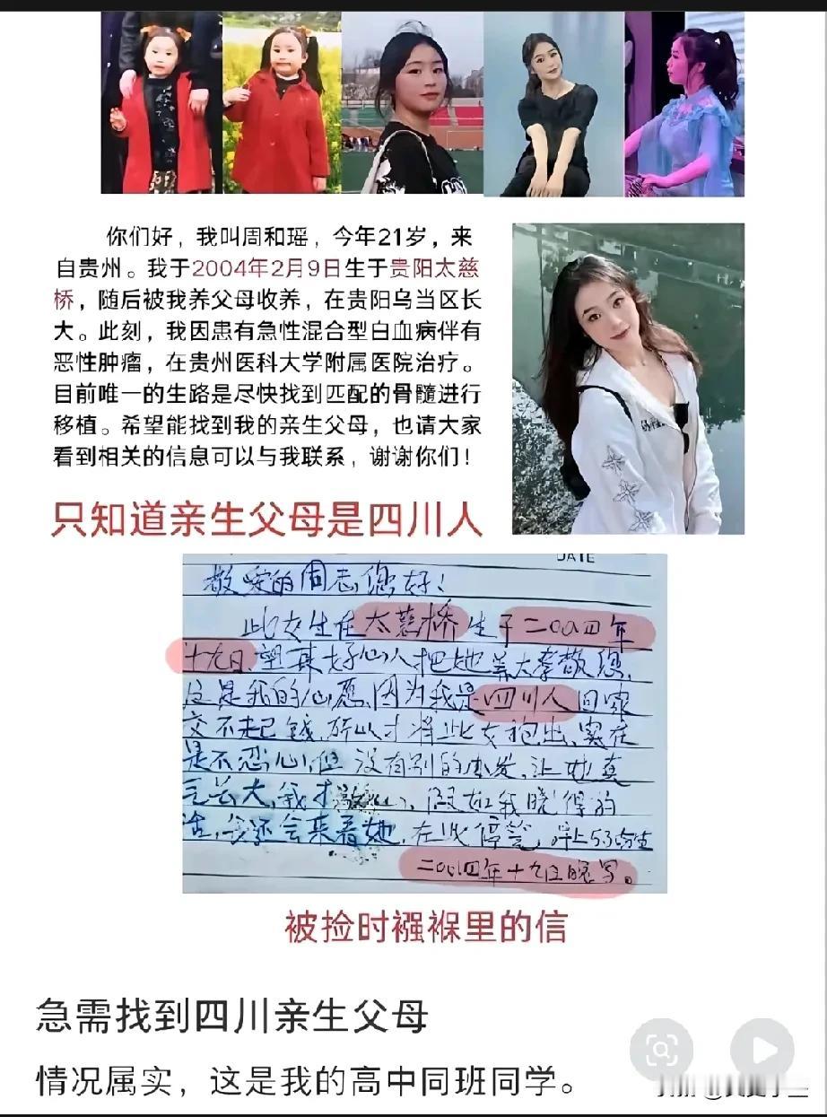 “爸爸妈妈,我知道你们当年有无奈,现在求你们来看看我,做一次骨髓配型,给我一次生下去的机会。女孩哭泣着说出了这句让人扎心的话! 女孩在刚出生后不久便被亲生父母遗弃,幸亏被现在的养父母看到了, 他们把女孩收养后视为己出,倾尽所有养育她,将女孩培养成为了一名优秀的大学生! 天有不测风云,人有旦夕祸福。女孩在准备考研期间突发高烧,随后被确诊患上了白血病。 众所周知,要想治愈白血病需要找到配型成功的骨髓进行移植。亲生父母或者兄弟姐妹适配度比较高,是最适合的人选! 然而,养父母与女孩虽有亲情关系但无血缘关系,他们虽然愿意捐骨髓救女孩但因年纪偏大,配型成功概率极低只能放弃! 为了救女孩,她的养父母找到了当地公安部门寻求帮助,想通过DNA寻亲找到女孩亲生父母。 在这个过程中,女孩无意间得知了自己原来不是他们的亲生女儿,亲生父母另有其人,即便如此她内心没有怨恨,非常感恩养父母这么多年对她的付出! 然而,20多年过去了,找寻亲生父母并非易事,唯一的线索便是一张泛黄的字条。字条显示,其亲生父母为四川人,2004年因在贵州交不起钱无奈抛弃了她。亲生父母承诺会回来探望,希望孩子争气长大、孝敬收养人。 女孩从出生到长大成人,亲生父母一直未出现过,也许是过的并不好,也许是有其他难言之隐吧!要不然谁会不要自己的亲生孩子,不希望看一下自己的孩子如今过的怎么样。 目前,贵州、四川两地公安部门已联系开展配合,希望她能早日找到亲生父母,要坚强的活下去,加油!