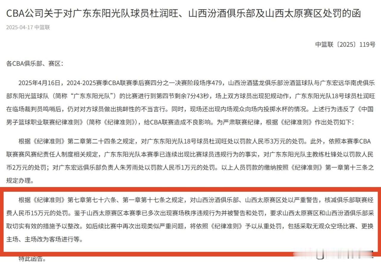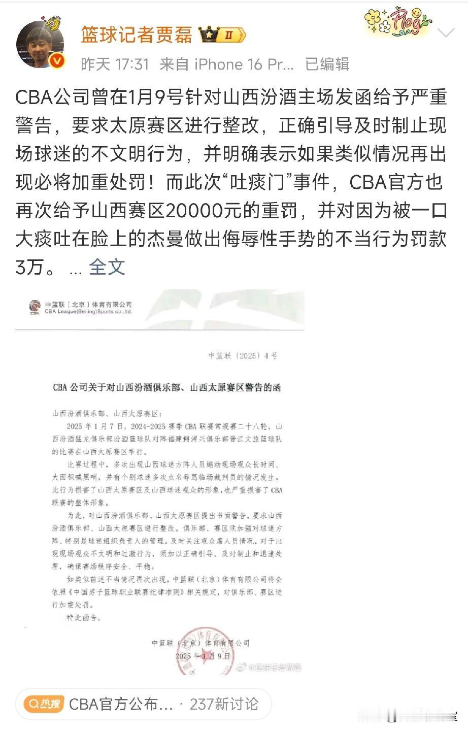 不吐不快!为什么CBA公司针对山西球迷对北京球员吐口水的处罚引发争议,原因是: 1、山西罚2万,杰曼罚3万,施暴者的处罚竟然比受害者还轻,简直荒唐! 2、1月9号,CBA公司已经对山西主场作出严重警告了,要求山西主场进行整改,并明确表示,若是山西主场再次发生类似事件,将加重处罚,但事实是此次的处罚并没有加重! 3、上赛季山西主场已经被严重处罚过了,处罚公告也明确表态了,主场再发生类似事件,将给予山西主场空场比赛或更换主场的处罚,但是这次山西球迷吐口水事件也只是罚款2万,更并没有说对山西队做出空场处罚的决定!