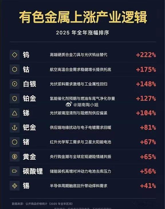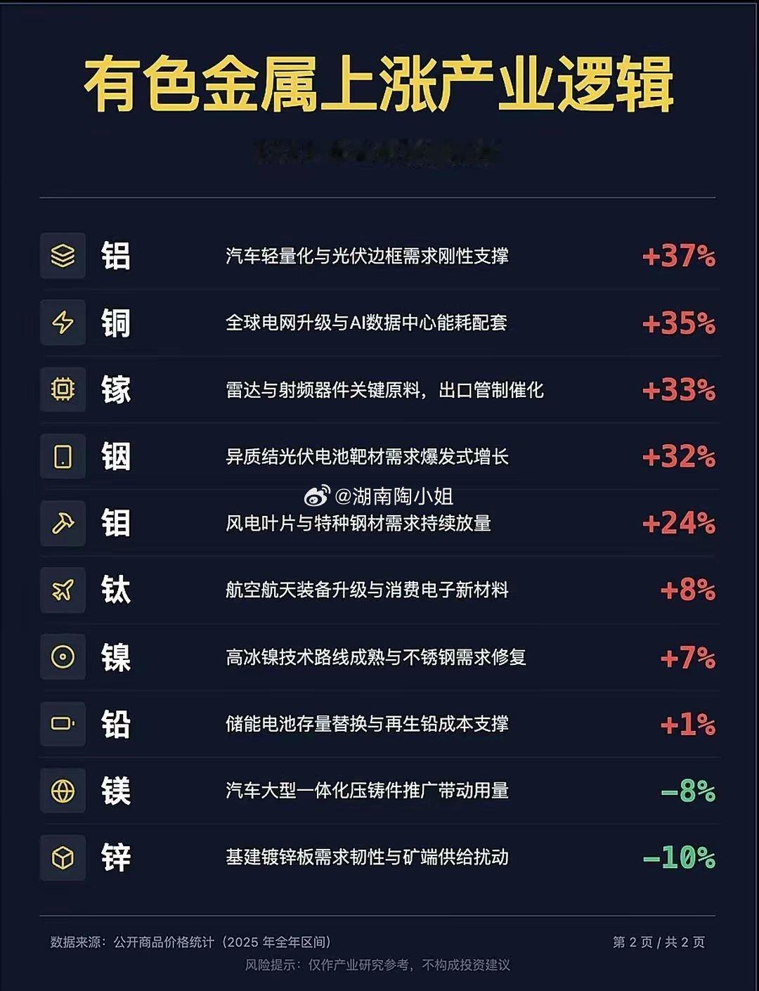 有色金属上涨产业逻辑(2025全年涨幅)2025 年,有色金属整体走出了一轮结构性上涨行情。表面看是价格上行,背后其实是多条产业线同时发力的结果:一是 AI 算力、电网、数据中心 带来的基础金属与战略金属需求抬升;二是 新能源、储能、光伏 对部分小金属形成阶段性供需缺口;三是 地源博弈与资源约束,使得部分高端、有战略属性的金属定价中枢明显上移。从结果看,2025 年涨幅靠前的核心有色,集中在三类:[一]第一类是战略与高端制造金属,如钨、钴、锑、铂金,直接受益于军工、航空航天与高端装备升级;[二]第二类是新能源与新材料相关金属,如碳酸锂、锡、镓、锗,需求更多来自储能、电池和半导体;[三]第三类是贵金属与避险属性金属,黄金、白银在全球货币与地缘不确定性下表现突出。进入 2026 年 1 月,有色整体已从“全面上涨”转向分化阶段:高位品种开始消化预期,供需仍紧的战略金属相对更稳,而部分传统工业金属需关注宏观节奏变化。整体来看,有色已不再是单一周期逻辑,而是产业趋势 + 宏观环境共同定价的结果。本文仅作产业研究交流,不构成投资建议。投资 金融 财经知识 股票 金融知识 投资理财 有色金属 财经