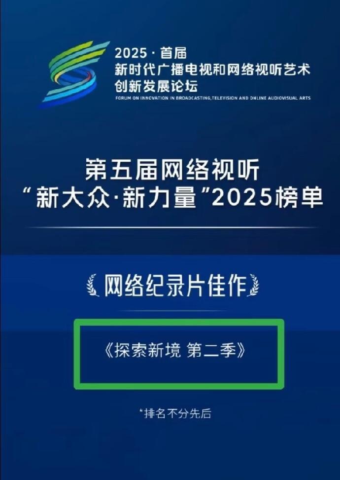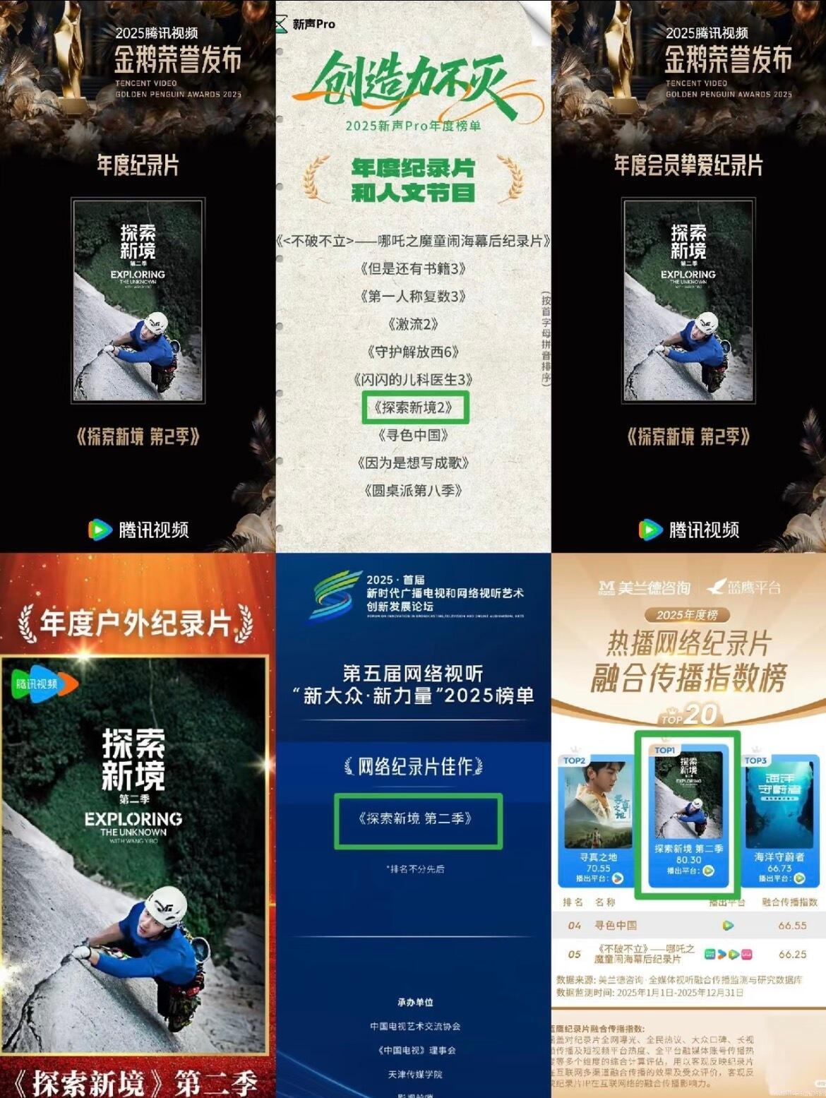 外媒报道:恭喜了王一博探索新境2在完结不到一个月的时间里又获得了年度纪录片荣誉目前为止已获得🏆美兰德2025年度网络纪录片融合传播指数TOP1;🏆《博客天下》“2025博娱年度推选”年度户外纪录片;🏆2025腾讯视频金鹅荣誉年度纪录片及年度会员挚爱纪录片;🏆第五届网络视听“新大众·新力量”佳作榜单! 🏆✖️2 年度纪录片探索新境2