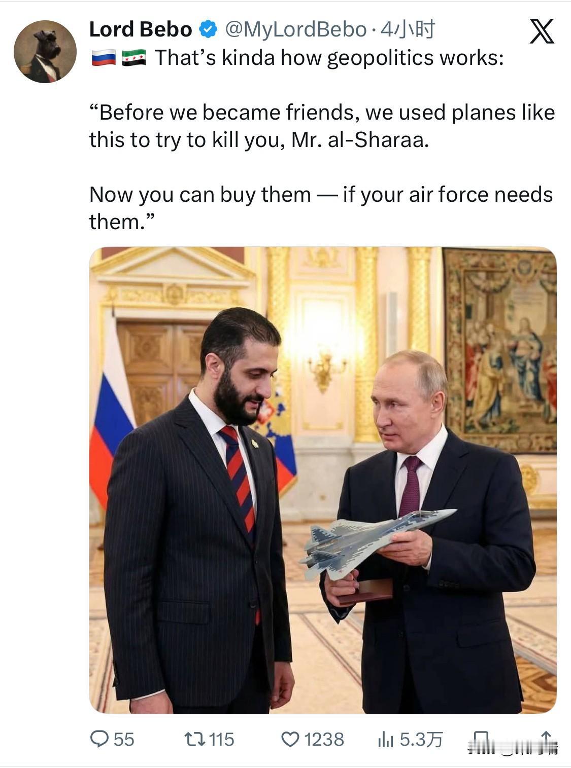 地缘政治的运作方式大致如此: “在我们成为朋友之前,我们曾用这样的飞机试图杀死你,沙拉先生。” 现在你们可以购买了——如果你们的空军需要的话。 叙利亚过渡政府总统艾哈迈德·沙拉(Ahmed al-Sharaa)目前正在莫斯科进行工作访问,并与俄罗斯总统普京举行了会晤。