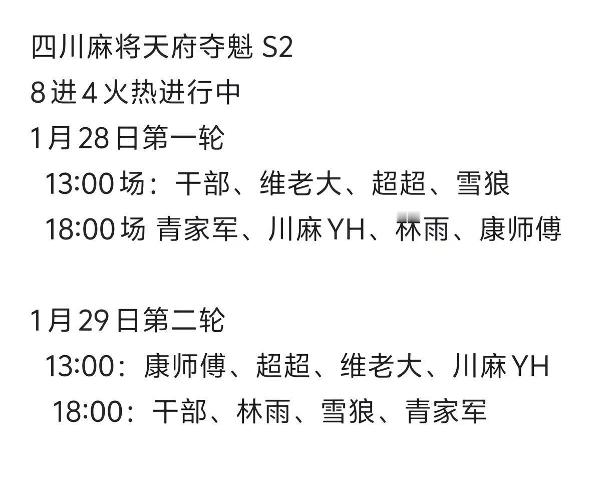 四川麻将天府夺魁 S28进4火热进行中1月28日第一轮 13:00场:干部、维老大、超超、雪狼 18:00场 青家军、川麻YH、林雨、康师傅1月29日第二轮 13:00:康师傅、超超、维老大、川麻YH 18:00:干部、林雨、雪狼、青家军