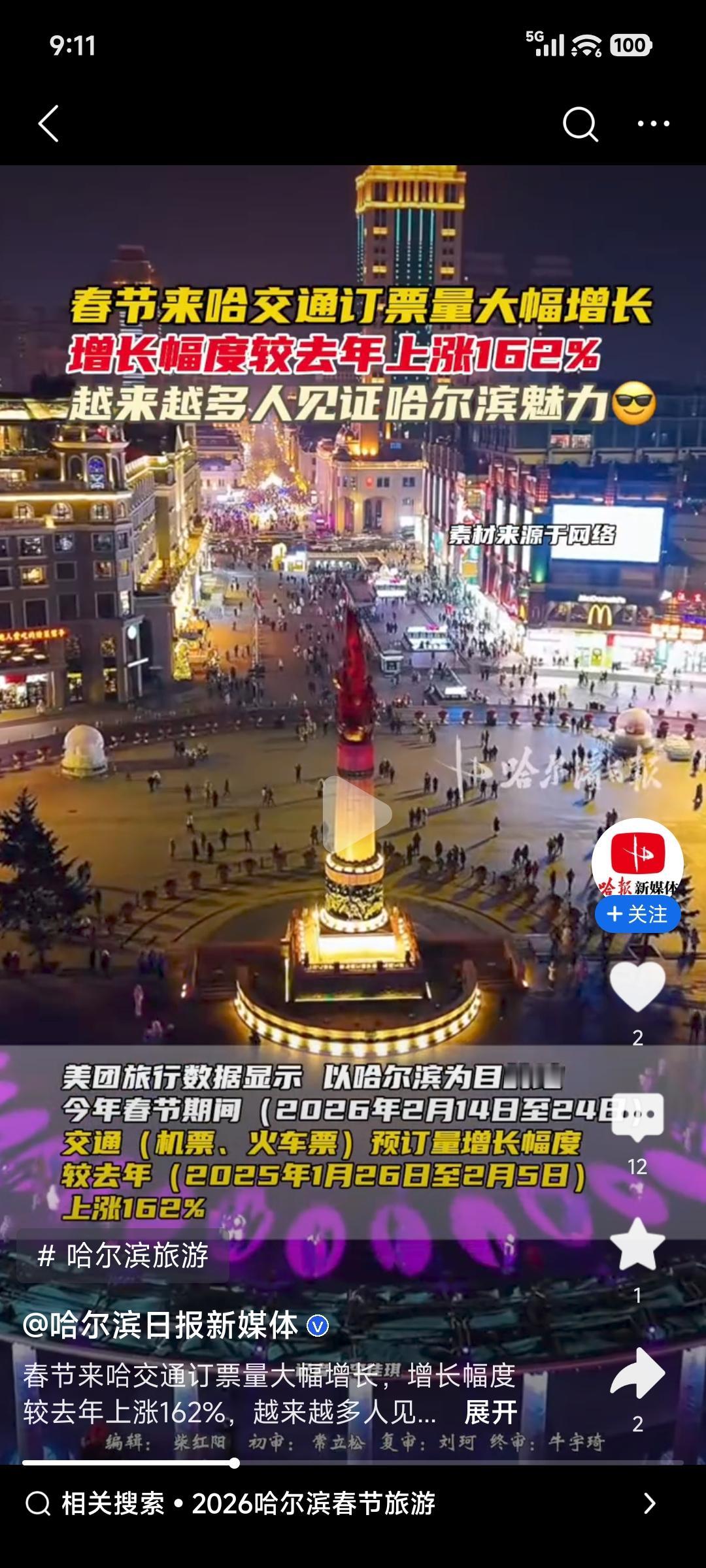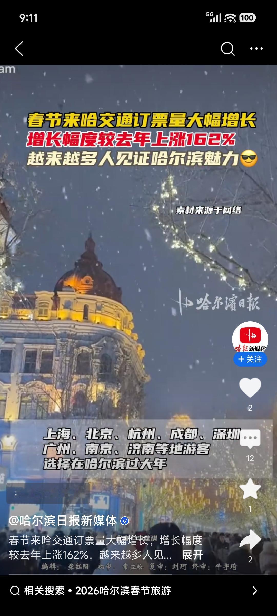 马年春节临近,哈尔滨旅游火出圈了!美团旅行数据显示,春节期间哈尔滨的交通预订量增长 162%,上海、北京等地游客都选择去哈尔滨过大年。1 月 27 日马蜂窝公布的“2026 春节热门国内城市 TOP10”榜单,哈尔滨凭借特色冰雪游成东北三省唯一上榜城市。 当地酒店和餐饮也跟着火爆起来,锦江集团维也纳酒店中央大街店春节房间预订过半,部分饭店年夜饭包房被游客订空。看来,哈尔滨这浓浓的冰雪年味儿,谁能拒绝得了呢?