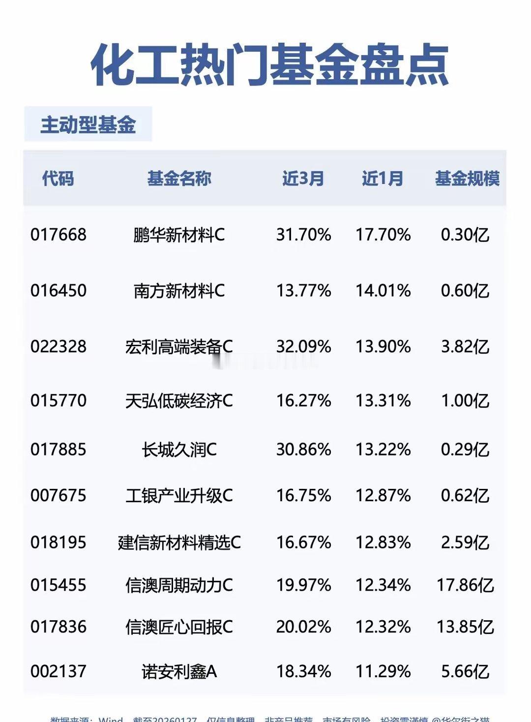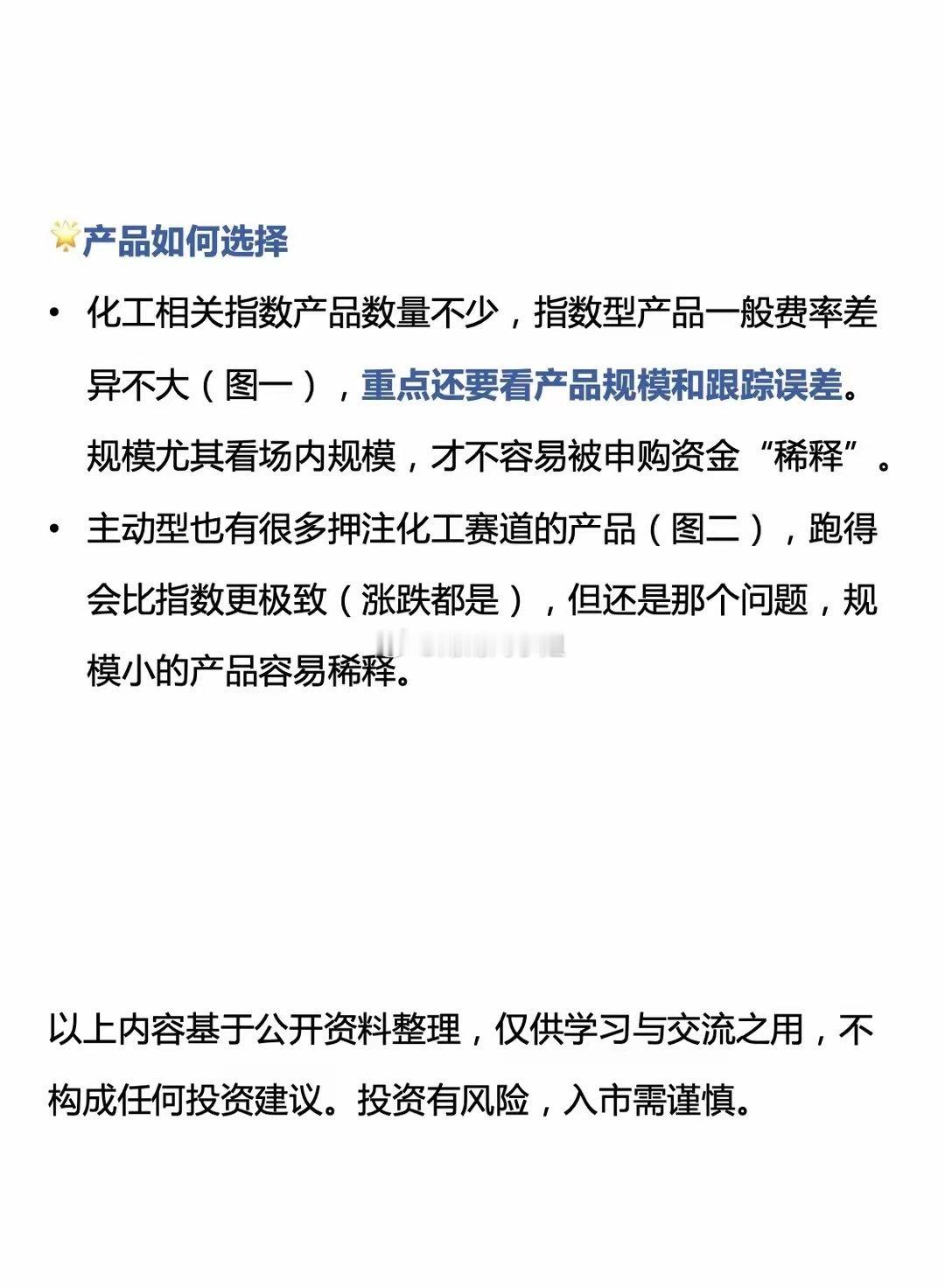 ❤️🔥化工板块热门基金产品盘点盘点了下化工板块的基金产品,做个分享。🌟化工接棒有色如果把这一轮行情拆开来看,有色更多是“价格先行”,化工更像是“需求接棒”。上游资源品在涨价阶段率先完成估值重估,而化工处在成本—需求—盈利逐步兑现的中段位置。从产业链位置看,化工横跨资源 → 材料 → 制造,既受益于上游价格变化,也更直接映射下游真实需求。这也是为什么,在有色被反复讨论之后,资金开始自然地向化工扩散。🌟场内资金持续提前布局从近一个场内流入来看,化工ETF净流入高居行业类ETF第三,仅次于黄金和有色金属,场内资金早已持续布局。以场内产品159870.SZ化工ETF为例,本月净流入超130亿。🌟产品如何选择化工相关指数产品数量不少(图一),指数型产品一般费率差异不大,重点还要看产品规模和跟踪误差。规模尤其看场内规模,才不容易被申购资金“稀释”。主动型也有很多押注化工赛道的产品(图二),跑得会比指数更极致(涨跌都是),但还是那个问题,规模小的产品容易稀释。以上内容基于公开资料整理,仅供学习与交流之用,不构成任何投资建议。投资有风险,入市需谨慎。公募基金 化工 有色金属 黄金 白银 热门基金 热门板块 基金界的灵魂画手