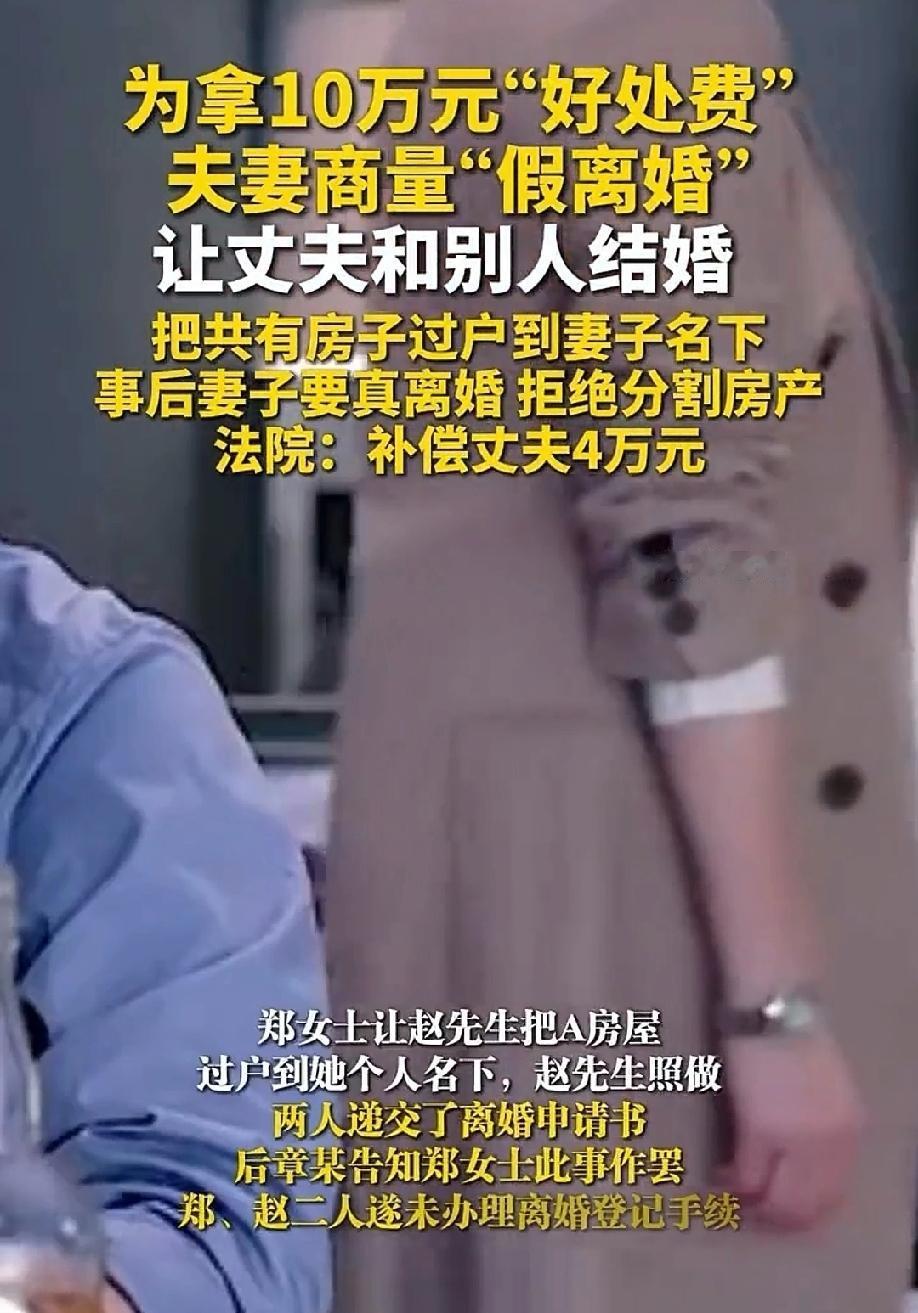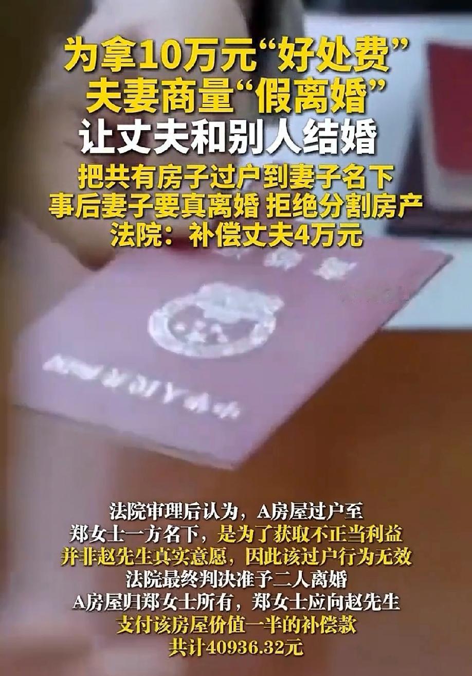 赔了夫人又折兵!女子告诉丈夫,她同事的妹妹家拆迁,为了多拿拆迁款,需要找个男子结婚,事后可得10万元酬谢。为了拿到这笔酬谢,女子和丈夫商量先假离婚,等事成后再复婚,还要求丈夫把房产过户到她一个人名下。不成想,房屋过户完,离婚证还没拿到,同事却提出此事作罢。这时女子却假戏真做,提起离婚诉讼,还声称这房子属于她个人财产。丈夫彻底寒心:同意离婚,但房子是我婚前购买的房产,一个假离婚就想拿走我的财产? 2019年9月,郑女士和赵先生喜结连理,步入了婚姻的殿堂。 婚后,赵先生出于对妻子的爱和对家庭的责任感,把自己婚前个人购买的一套房屋登记成了夫妻两人共有。 当时赵先生想着,夫妻本是一体,这样能让妻子更有安全感,日子也能过得更和美。 可谁知,房产加名并没有换来妻子郑女士的感恩,反而给他的财产损失埋下了伏笔。 2024年5月,郑女士从同事张某那儿听来一个“赚钱”的门道。 据张某透漏,她妹妹家要拆迁,为了多拿一些拆迁补偿款,现在急需找个单身男子结婚,事成之后还能给10万元酬谢。 郑女士一听,这钱来得挺容易,心里就开始打起了小算盘,马上回到家,就跟赵先生商量起“假离婚”的事儿。 她跟赵先生表态:老公,咱先假离婚,你去和张某妹妹结婚,等拿到那10万块钱,咱再复婚。 郑女士考虑到很周到,为了避免财产不被张某妹妹分割,她还提出让赵先生“净身出户”,把他们共有的房产过户到她一个人名下。 赵先生一开始有点犹豫,他不由得有些担忧,这假离婚靠谱吗? 可看着妻子那期待的眼神,又想着也就是走个过场,为了那10万块钱,咬咬牙就答应了。 于是,赵先生按照郑女士说的,把房产过户到了郑女士名下,两人还递交了离婚申请书。 可谁能想到,没过多久,张某就告诉郑女士,这事儿作罢了,他妹妹不再找人结婚了。 本以为这样就不用离婚,他们还能安安稳稳的过小日子,可郑女士却有她的想法。 她转念一想,这房子都已经到自己名下了,要不就假戏真做得了。 2025年3月,郑女士直接向法院提起了离婚诉讼,还声称这套房产是她的个人财产。 法庭上,赵先生觉得特别委屈和心寒:我当初那么信任你,配合你假离婚,把房子都过户给你了,你现在居然来真的,还想独吞房子。 于是赵先生主对离婚没有异议,但他要求这房产得进行分割。 可郑女士却理直气壮地表示:这房子登记在我名下,现在属于我个人财产,凭什么分割。 郑女士咬定不动产登记的产权,死活不让步,赵先生以婚前个人财产为名,誓要夺回这套房产,法院到底该如何审理呢? 法院审理认为,对于离婚一事,两人都同意离婚,没有异议,认定感情破裂,准予离婚。 至于财产纠纷,这套房屋过户到郑女士名下,是为了获取不正当利益,并不是赵先生真实意愿的表达,所以这个过户行为是无效的。 最终,法院判决准予二人离婚,房产归郑女士所有,但是郑女士得向赵先生支付该房屋价值一半的补偿,共计4万余元。 赵先生怎么也没想到,一场假离婚的闹剧,最后落得这样的结果,真的是赔了夫人又折兵。 这一系列的操作,让人不得不怀疑,郑女士就是为了算计这套价值8万元的房产。 她先是主动怂恿丈夫假离婚,然后提出房产过户至自己名下以规避“风险”,其每一步都围绕房产转移设计。 郑女士从甜言劝说至诉讼中理直气壮独占房产,可见其核心目标并非10万元酬谢,而是早已觊觎该房产,假离婚只是其实现财产侵占的工具,预谋性贯穿始终。 这样算计的婚姻,走到离婚也是迟早的事,只是辜负了一场信任,辜负了一段感情。