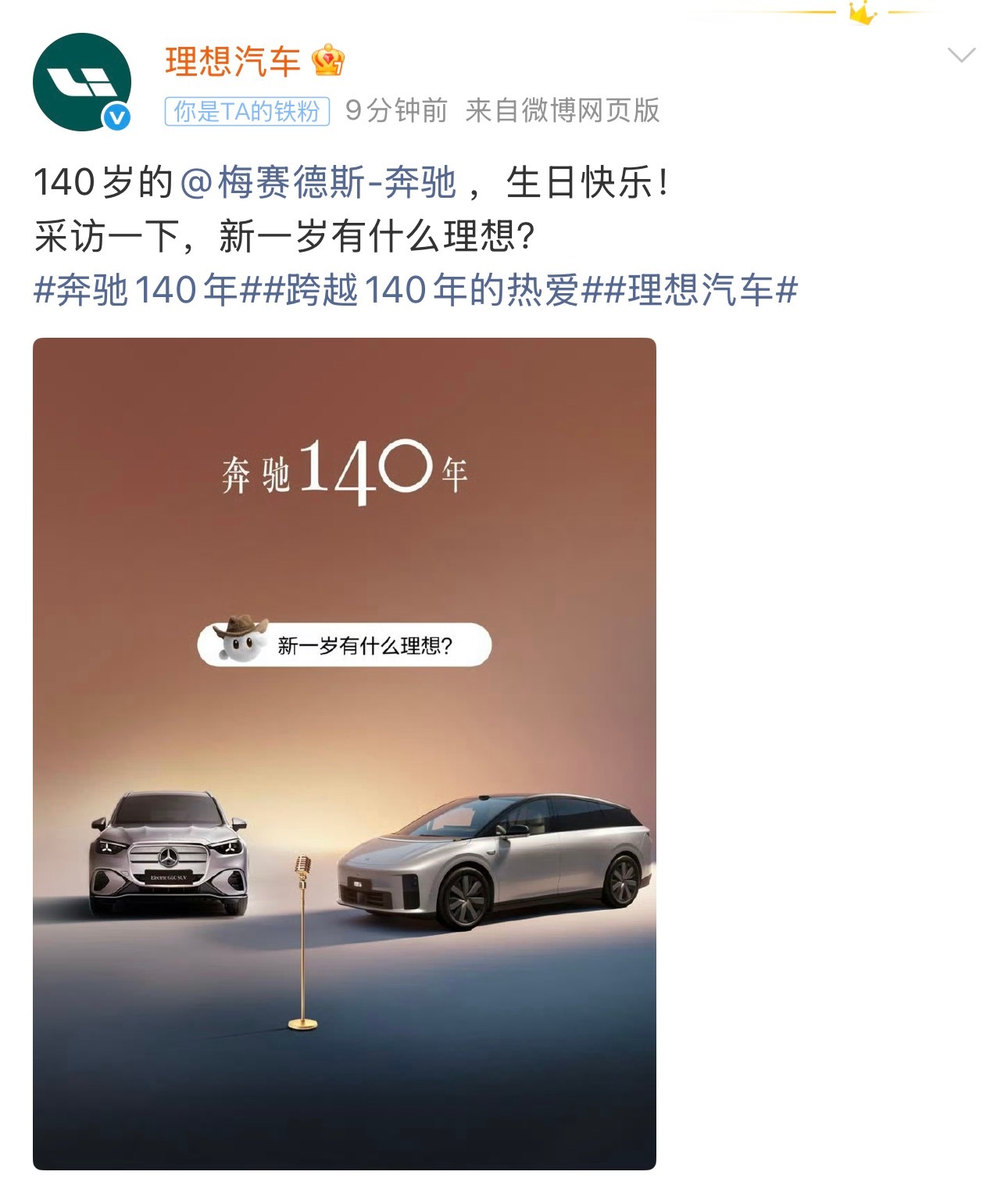 理想祝奔驰140岁生日快乐 老寿星的面子还是够的今天是奔驰140岁生日估计也收到了国内外不老少的祝福作为汽车的发明者,140年的时间里,的确给这个世界带来了很多便利和快乐~