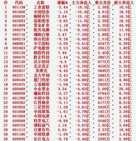 1月29日开盘45分钟,主力“卖出的 ”30名单! 工业富联:净流入 -19.2亿元 中国铝业:净流入 -15.4亿元 铜陵有色:净流入 -15.1亿元 洛阳钼业:净流入 -11.0亿元 紫金矿业:净流入 -9.90亿元