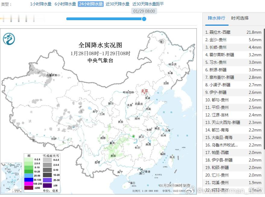 【大范围雨雪过程开启】昨天到今晨,西藏聂拉木出现大暴雪,昨晚积雪一度达到了15厘米,今晨还有13厘米。导致强降雪的高空槽继续东移,今后3天,中东部将有大范围雨雪。本轮降水过程,有偏南风和偏东风输送水汽,水汽条件较好,因此部分地区降雪为湿雪,积雪效率可能不是很高。1月29日08时至30日08时,新疆伊犁河谷和沿天山一带地区、内蒙古中西部、东北地区东部、西藏北部和东部、西北地区中东部、华北中西部、黄淮西部、江汉西部、川西高原北部等地部分地区有小到中雪或雨夹雪,其中,西藏东南部、陕西东南部、河南西部、湖北西北部等地部分地区有大到暴雪(10~16毫米)。陕西南部、湖北西部局地有冻雨。1月30日08时至31日08时,内蒙古中部、黑龙江中部、西藏东部、青海东部、甘肃东部、陕西南部、华北大部、黄淮南部、江淮、江汉西部、湖南中北部、川西高原北部等地部分地区有小到中雪或雨夹雪,其中,湖南北部局地有大雪(5~8毫米)。贵州东部、湖南西部局地有冻雨。1月31日08时至2月1日08时,黑龙江中部、西藏北部和东南部、甘肃西部、四川西北部、湖北南部、湖南北部、安徽南部、江苏南部、浙江北部等地部分地区有小到中雪或雨夹雪。