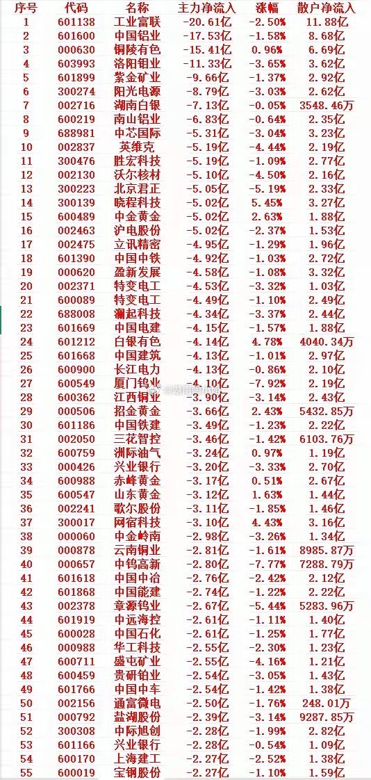 1月29号开盘30分钟,主力资金“卖出的 ”个股名单1 601138 工业富联 -20.61亿 -2.50% 11.88亿2 601600 中国铝业 -17.53亿 -1.58% 8.68亿3 000630 铜陵有色 -15.41亿 0.96% 6.69亿4 603993 洛阳钼业 -11.33亿 -3.65% 3.62亿5 601899 紫金矿业 -9.66亿 -1.37% 2.92亿6 300274 阳光电源 -8.79亿 -3.03% 2.62亿7 002716 湖南白银 -7.13亿 -0.05% 3548.46万8 600219 南山铝业 -6.83亿 -0.64% 2.35亿9 688981 中芯国际 -5.31亿 -3.04% 3.23亿10 002837 英维克 -5.19亿 -4.44% 2.19亿11 300476 胜宏科技 -5.19亿 -1.09% 2.77亿12 002130 沃尔核材 -5.10亿 -4.50% 2.16亿13 300223 北京君正 -5.05亿 -5.19% 2.33亿14 300139 晓程科技 -5.02亿 5.45% 3.27亿15 600489 中金黄金 -5.02亿 2.63% 1.88亿主力资金出逃高度集中,头部标的净流出规模显著主力净流出榜单中,前 5 只标的净流出均超 9 亿,工业富联以 - 20.61 亿居首,中国铝业、铜陵有色、洛阳钼业、紫金矿业紧随其后,前 20 只标的主力净流出基本都在 4 亿以上,说明主力资金在这些标的上的撤离意愿极强,且出逃规模具有明显的头部效应,资金从核心标的中集中撤出的特征突出。多数标的呈现 “主力出逃 + 股价下跌” 的同步走势,资金撤离对股价形成直接压制超八成标的出现主力净流出的同时股价下跌,其中洛阳钼业(-3.65%)、英维克(-4.44%)、沃尔核材(-4.50%)、北京君正(-5.19%)、厦门钨业(-7.92%)等标的跌幅居前,且对应的主力净流出规模均在 5 亿上下,主力资金的撤离成为股价下跌的重要推手,资金面的弱势直接反映在股价表现上,标的的交易情绪随主力出逃走弱。少数标的出现 “主力出逃 + 股价上涨” 的背离,资金博弈特征凸显有部分标的走出了与主力资金流向背离的走势,如晓程科技(5.45%)、中金黄金(2.63%)、白银有色(4.78%)、招金黄金(2.43%)、网宿科技(4.44%)等,这类标的在主力净流出的情况下股价逆势上涨,且散户资金均有不同程度的净流入,说明这类标的中散户资金成为接盘和推动股价的主要力量,场内资金博弈激烈,主力资金的撤离与散户资金的进场形成鲜明对比,短期股价走势由散户资金主导,但这种背离走势的持续性存疑,主力资金的持续出逃或为股价后续走势埋下隐患。散户资金普遍进场接盘,净流入规模与主力出逃规模呈明显差距所有标的均出现散户资金净流入,但其净流入规模远低于主力净流出规模,如工业富联散户净流入 11.88 亿,仅为主力净流出规模的一半左右,多数标的散户净流入规模不足主力净流出的三成,甚至部分标的散户净流入仅数千万级别。这一数据反映出散户资金在主力撤离时的接盘行为,但散户资金的承接力度有限,难以对冲主力资金出逃带来的资金面缺口,市场整体呈现出 “主力大撤、散户小接” 的资金格局。标的板块属性偏向资源、制造、科技等方向,相关赛道资金面承压上榜标的主要集中在有色金属(中国铝业、铜陵有色、紫金矿业等)、黄金(中金黄金、招金黄金等)、半导体 / 科技(中芯国际、北京君正、沪电股份等)、高端制造(工业富联、立讯精密等)、基建 / 中字头(中国中铁、中国电建、中国建筑等)等赛道,这些赛道均出现主力资金的集中撤离,说明相关板块的资金面整体承压,主力资金对这些赛道的短期走势持谨慎态度,资金从这些板块中撤出的动作较为明显。