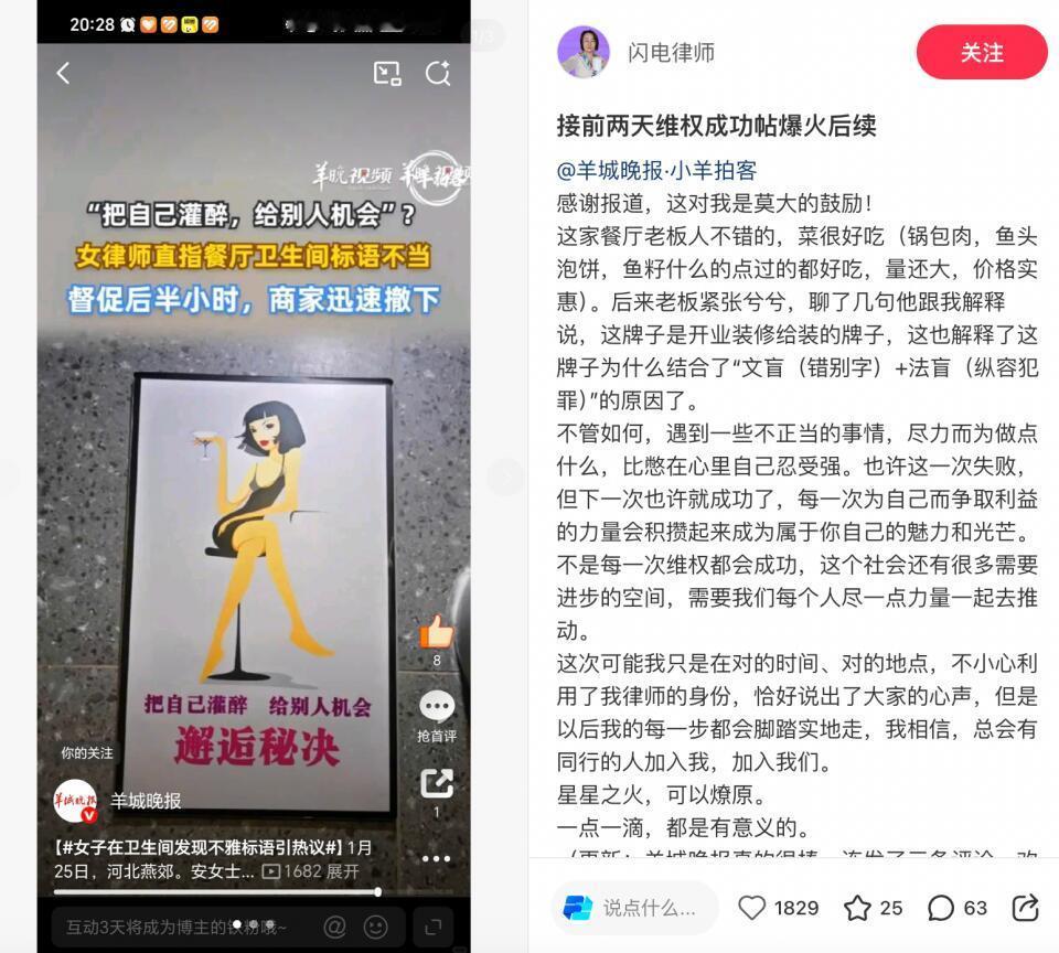 最近有个事挺有意思的,是一位女律师维权的成功案例。她说自己是“闪电律师”,在河北燕郊一家常去的餐厅吃饭时,发现女洗手间里挂了个标语牌,上面写着“把自己灌醉,给别人机会”,还美其名曰“邂逅秘诀”。 这位安律师一看就火了,觉得这牌子“思想太恶臭”。她认为,这种话把女性物化了,而且模糊了性侵害里责任归属的界线,听着像是把错推给了喝醉的人,而不是该谴责施害者。更别说,这餐厅里经常有家庭带孩子来吃饭,这种错误的观念,很容易给未成年人带来不好的影响。 她也没吵闹,直接拍了张照片发给餐厅老板,很明确地告诉老板:“女洗手间这个牌子撤掉吧,思想太恶臭了,纵容犯罪。”好在餐厅老板也挺明事理,半个小时后就给她反馈,说牌子已经撤了,还专门拍了段视频发给她证明。 这事虽然看起来不大,但安律师觉得挺有意义的。按照相关法律解读,餐厅作为经营者,有义务提供文明、健康的消费环境。厕所里挂这种标语,其实已经涉嫌违反了规定,往严重了说,市场监督管理部门是可以要求整改甚至罚款的。 安律师在分享这个事的时候说了一句话,我觉得挺好:“社会的进步往往是较真的人在推动。”可能有些人会觉得,就这么句话,是不是小题大做了?但仔细想想,这种标语确实有害无益,尤其不该出现在孩子可能看到的地方。每一次有人觉得“不服输、不能忍”,站出来纠正一下,周围的环境可能就真的变好一点点。