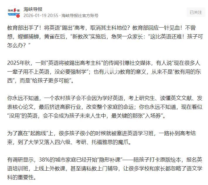 教育部出手了!将英语“踢出”高考,取消其主科地位?教育部回应一针见血!不曾想,螳螂捕蝉,黄雀在后,“新教改”实施后,急哭一众家长:“这比英语还难!孩子可怎么办?” 政策一出,几家欢喜几家忧,家长们开始焦虑,网络上的声音层层叠叠,真假难辨。 但真正了解政策之后,很多人才发现,他们慌了一个“乌龙”。 教育部早就明确回应:“英语仍是高考的重要科目,分值并未削减,主科地位没有变化。” 事实上,在多数省份,英语依旧维持150分的总分,仍然是和语文、数学并列的三大主科之一。 真正的变化,不在于“取消”,而在于“怎么考”,以及“考什么”。 比如,北京市早在2021年就将英语听说测试分值提升至60分,占总分的1/3。 上海、江苏、浙江等地也陆续推行了人机对话、听说同测的模式。 这不是在弱化英语,而是在对“哑巴英语”动刀,过去那种“听不懂、不会说、只会做题”的英语学习方式,正在被一次彻底的翻篇。 这场改革的核心,不在于“踢出”,而在于“转身”,从应试走向应用,从书本走向场景,从死记硬背走向真实交流。 真正被“踢出”的,是那种靠刷题、灌输、背模板、押题技巧堆积起来的“分数型英语”。 2024年秋季,新一轮高考改革在全国多地启动试点,家长们的焦虑并没有因为“英语没被取消”而减轻,反而在政策逐渐落地后,有了更深层的担忧。 “这比学英语还难!”这是不少家长在新政策下的真实反应。 以上海为例,高考英语改革后,听说测试分值提高至35分,并且听说部分采用人机对话形式。 学生要在规定时间内,根据提示完成对话、陈述甚至即兴表达,考题场景真实,比如“你是一个转校生,正在竞选学生会主席,请用英语介绍你的优势。 “孩子平时成绩挺好,一到机考就紧张,听力跟不上,口语磕巴。”——这是某重点中学一位家长的吐槽。 他女儿为了应对听说测试,专门报了两个在线外教班,一对一训练发音和临场反应,费用一个月就超过了两千元。 北京一位高三老师坦言:“现在的英语考试,比以前更需要综合能力,你不能只靠刷题拿高分,得真会说、真能听懂、还能临场输出。” 新版英语教材中,出现了大量中国文化元素,比如,课文里讲述四合院的布局、端午节的来历、京剧的艺术形式。 在四川,一些中小学还开展了“用外语讲好中国故事”的课堂实践,学生需要用英文介绍自己的家乡、传统节日,甚至是中国的高铁、5G。 这背后的逻辑,是希望英语不再只是“为了高分”,而成为“表达中国、连接世界”的工具,英语不再只是考试工具,而是一种文化输出的能力。 但这背后,也带来了更大的挑战。 2025年9月,教育部正式推行“高一开齐课程,高二再选科”的政策,意在让学生在全面接触课程之后再做选择,避免过早功利化,但实际操作中,不少家长反而更加焦虑。 “以前早分班,孩子从高一就知道自己走哪条路,现在是啥都学,学着学着就乱了。”广州一位家长在微博上直言不讳。 他儿子本来是准备走理工科路线,但高一被要求也学音乐、美术、历史,感觉时间被“浪费”了。 新高考赋分制的实施,也让原来的“分数逻辑”变得更加模糊,同样是考了85分,在不同学校、不同群体中,最后的转换分可能会差出好几分。 过去那种“稳进985”的分数线,现在变得难以预测,家长失去了“硬标准”,规划孩子未来的路径也变得更难。 这种不确定性,在城乡差距上体现得尤其明显。 在一些偏远地区,学校依旧缺乏合格的英语教师,听说训练更是无从谈起。 而与此同时,北京、深圳的一些学校已经在尝试用AI模拟口语对话,甚至用ChatGPT辅助学生练习英语写作。 资源的不均衡,让这场改革对某些群体来说,反而成了一道新的门槛。 专家指出,如果教育资源不能同步倾斜,那么改革再先进,也可能加剧教育的不公平。 英语改革的出发点是好的,但如果缺乏配套机制,最终受伤的,仍是弱势群体。 尽管如此,改革的方向仍然是明确的,教育部并没有“踢出英语”,而是在纠正它的使用方式。 现在,政策正试图把英语拉回到“语言工具”的本质上,它可以是出国的桥梁,是跨文化沟通的钥匙,是讲述中国故事的媒介。 未来,不同赛道对英语能力的需求也将产生分化。 比如职业教育体系中,英语将更偏向实用性,考查的是行业英语、基础交流能力。 综合性大学则更看重学生的批判思维与表达能力,家长也需要逐步转变思维,从“考高分”转向“真能力”。 教育不是一场短跑,而是一场马拉松,眼前的混乱、焦虑、对新政的不适应,都是“转型期”的正常现象。 真正的挑战,是我们是否愿意接受“旧逻辑”的崩溃,去适应一套新的、或许更复杂,但更真实的教育系统。 教育不是注满一桶水,而是点燃一团火,英语改革的火焰,也许正是那个照亮孩子走向世界的第一道光。 真正的问题不是英语考不考,而是我们是否准备好了,迎接一个不完全靠“刷题”的未来。
