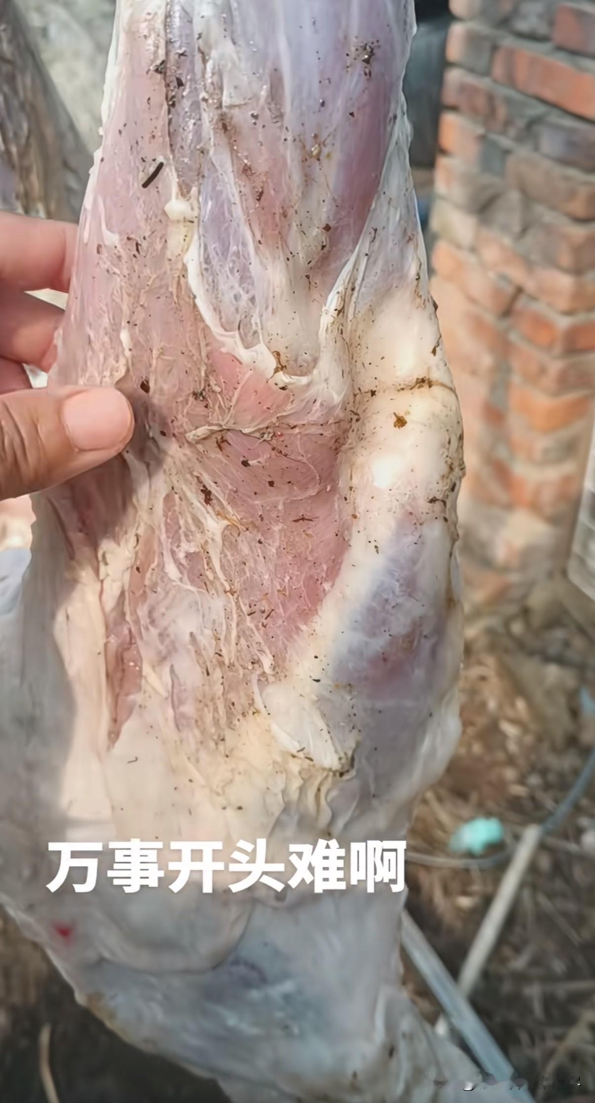 新鲜羊肉掉在地上后,为什么用水洗不掉羊肉上面沾着的土呢? 安徽一女子早上自己家里杀羊,当她把新鲜羊肉挂在绳子上的时候,不小心将羊肉掉在了地上,羊肉上面沾了很多的土,女子用清水冲洗了很多遍,却怎么也洗不掉羊肉上面沾着的土,无奈只能将沾土的羊肉用刀给切掉扔了,看的我都心疼那些被扔掉的羊肉了! 真的很好奇,新鲜羊肉掉在地上沾上土后,为什么会这么难清洗呢,除了用刀切掉沾土的羊肉,大家知不知道还有什么好一点的方法,来清洗这沾土羊肉呢?