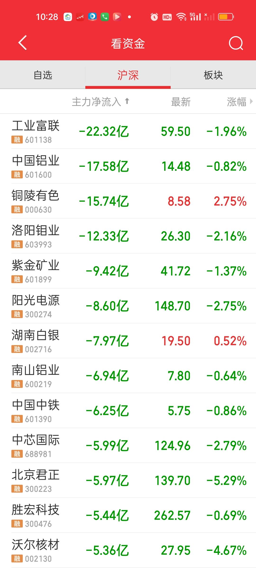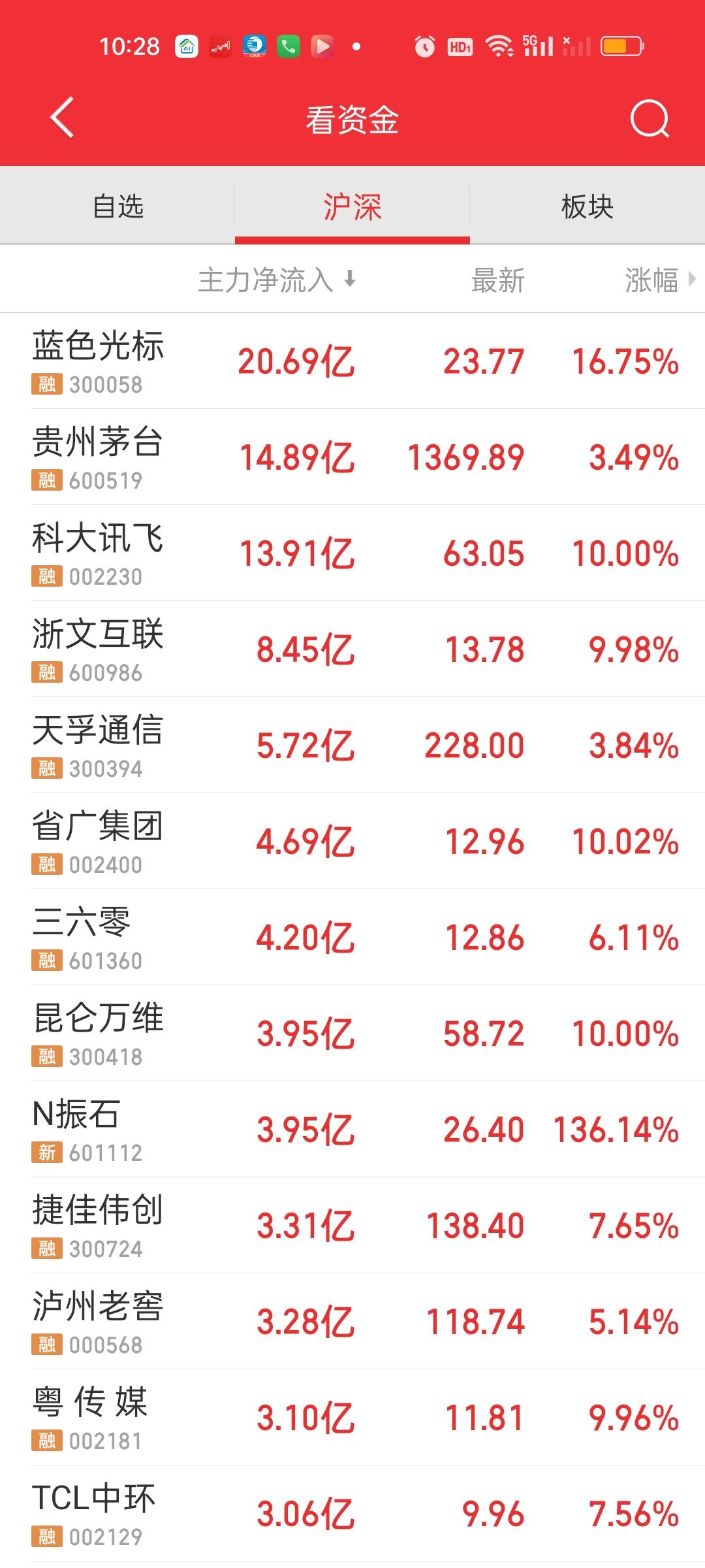 今天对于昨天追高有色金属和稀有金属的人来说是很残忍的,刚追进去就遇到了大跌。割也不是,补也不是,进退两难。 大盘资金依旧是持续流出的状态,虽然指数是緑的,但是个股有近3000家上涨,赚钱效应反而要好于昨天。今天又有一副奇葩的走势。黄线上穿黑线想要带动大盘起涨,可是根本就带不动,前面整个市场只有几百家上涨,指数反而是暴涨20点以上的。看来拉指数这活儿小微盘压根干不了! 今天蓝色光标,贵州茅台,科大讯飞资金大幅净流入,工业富联,中国铝业,铜陵有色,洛阳钼业,紫金矿业资金是大幅流出的。前五就有4个是金属。