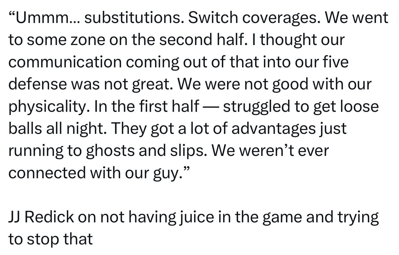 JJ·雷迪克谈到比赛缺乏活力以及试图阻止这种情况:“嗯……关于换人。调整防守战术。我们下半场用了一些区域联防。我觉得在(区域联防后)回到盯人防守时,我们的沟通很糟糕。我们的身体对抗性也不够。上半场——整晚都抢不到地板球。对手光靠着无球跑动和挡拆后内切就获得了大量优势。我们的盯人防守始终没有连贯性。”骑士战胜湖人