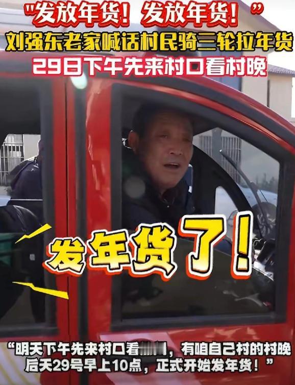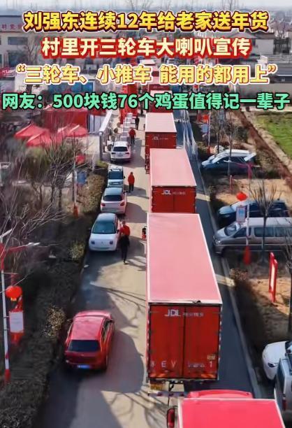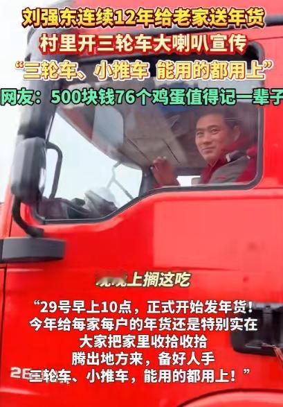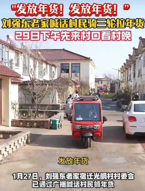 刘强东,让人泪目了! 1月27日晚上,最近很低调的刘强东,突然冲上了热搜,不是因为奶茶妹妹,而是因为宿迁光明村的乡亲们要忙坏了! 光明村的村委会大喇叭从白天到晚上就没停过,熟悉的乡音一遍遍在村里的街巷里回荡,“发放年货!发放年货!1 月 29 号上午正式发,28 号下午先到村口看村晚咯!” 后面还特意补了一句,“家里的三轮车、小推车,能用上的都拾掇拾掇,今年的年货实在得很!” 大喇叭的声音刚落,村里就更热闹了,大爷大妈们翻出家里搁在院角的三轮车,擦灰打气忙个不停。 年轻人则喊着邻居合伙,把小推车搬出来检查,就连孩子们都跟着凑热闹,在村里的小路上跑来跑去,嘴里喊着要去村口看货车、等村晚。 从 27 日上午开始,村里的烟花就轮流着放,噼里啪啦的声响裹着浓浓的年味,飘在光明村的上空,这份热闹,是刘强东为老家的乡亲们带来的,也是光明村每年春节最期待的光景。 乡亲们的期待从不会落空,13 辆满载年货的车辆早已顺利抵达光明村,打头的还是京东第六代智能配送无人车,后面跟着的 8 辆大货车,每一辆都装得满满当当,车身上贴着鲜红的标语:“光明村乡亲们的新年大礼,准时送达!” 格外扎眼。 更让人暖心的是,这次送年货的物流车队里,有个司机叫蒋晓波,就是光明村本地人,开着大货车回到自己的老家,给乡亲们送上年货,他跟记者说:“能给老家送年货,我心里特别骄傲,这事儿,再累我也乐意!” 货车一停稳,村里的工作人员就忙着卸货、清点、码放,村委会的广场上早早挂满了红灯笼,红彤彤的一片,超万件年货堆得整整齐齐,一眼望过去特别壮观。 这已经是刘强东连续 12 年给老家的乡亲们送年货、送福利了,这份坚持,一守就是十二个春秋。 从 2015 年开始,刘强东就没落下过一年,2015 年那时候,他回到光明村,给全村 680 多位 60 岁以上的老人,每人发了 1 万元的春节红包,那时候起,他就跟乡亲们说,以后每年,他都会记着老家的人。 到了 2024、2025 年,羽绒服、坚果礼盒、千元年货大礼包接连送到乡亲手中,2025 年的年货加现金红包总价值更是超过 3000 万元。 光明村的乡亲们从来都记着,这份十二年如一日的牵挂,源于三十多年前的一份温暖。村里的老人们提起刘强东,还是习惯喊他 “大强子”,念叨着他小时候家里条件不好,1992 年考上中国人民大学的时候,连上学的路费都凑不齐。 那时候的光明村,家家户户的日子都不算富裕,但大家伙儿看着这孩子懂事又爱学习,打心底里疼惜,你凑一块钱,我拿五毛钱,最后硬是凑出了 500 元路费,还有 76 个鸡蛋,塞到了刘强东的手里,送他踏上了北上的求学路。 老人们说,那时候方圆几百里就出了这么一个考上人大的人物,全村人都跟着高兴,谁也没想过要什么回报,只是觉得这孩子有出息,不能被钱绊住脚。 这次的年货派送,刘强东的父母早早回到了光明村,成了村里最亮眼的一抹温暖。 年近八旬的父亲低调现身村中,老爷子每天都会在村里溜达,看着工作人员忙活,和乡亲们唠唠家常,手里还总拿着一大包奥利奥、巧克力之类的零食,见着孩子就分上几块,见着来打卡的网友也热情招呼。 有乡亲想让老爷子转交一封感谢信给刘强东,老爷子却婉拒了,只朴实地说了一句 “别给他添麻烦”,这份低调和谦和,让乡亲们心里格外暖和。 还有村民打趣,老爷子怕是全村唯一没收到年货的人,毕竟这些年货都是自家孩子准备的,哪还用特意领,这话一出,老爷子和周围的人都笑作一团,满是温馨。 而光明村的欢乐,远不止领年货这一件事。1 月 28 日下午的村晚,早早就被乡亲们盼上了,舞台搭在村口的稻田边,京东云负责全程的直播推流,四台摄像机、两条备用链路,就为了让全国网友都能一起感受这份乡村年味。 村里的热闹还吸引了不少邻村的人特意过来围观,他们说,虽然领不到年货,但看着这样暖心的场面,心里也跟着高兴,方圆几百里能出这么一个知恩图报的企业家,是所有人的骄傲。 就连光明村的民宿,都因为这次的年货派送提前订满了,不少游客特意赶来,就想看看无人车送年货的新奇场景,县里的旅游局统计,二月的访客量同比涨了两倍,这份乡土间的温暖,还带动了家乡的发展。 从三十多年前的 76 个茶叶蛋和 500 元路费,到如今超万件的年货、持续升级的乡村帮扶,从一个人的感恩,到一群人的温暖,这份朴素的乡土情,在这个新春里,打动了无数人。 对于这件事,您有什么想说的吗?欢迎评论区留言讨论。 信源:新华日报交汇点2026-01-28——《1月27日,江苏宿迁。刘强东连续12年给老家送年货,村里开三轮车大喇叭宣传…》