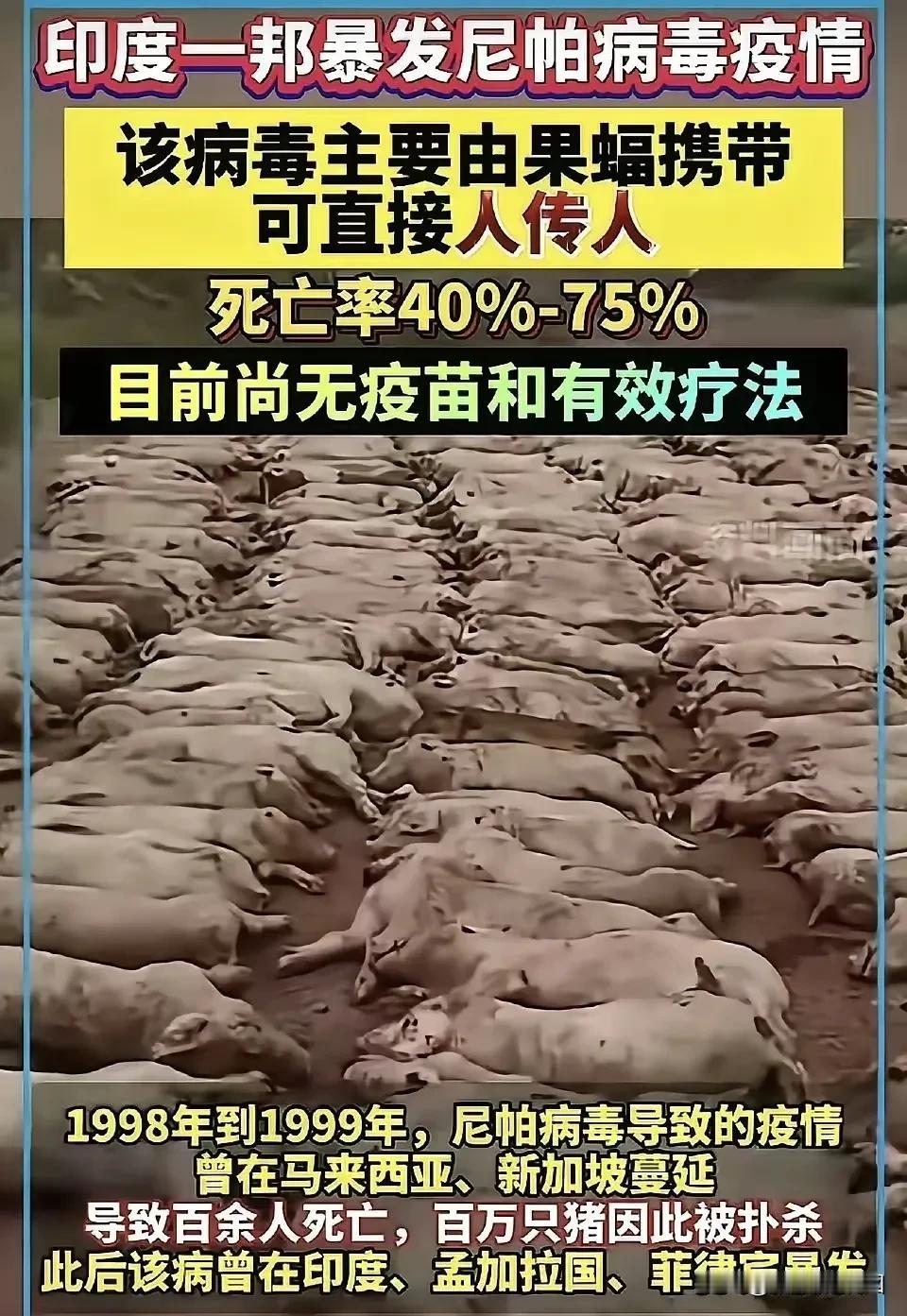 印度尼帕病毒,世界两大毒源,一是大漂亮生物实验室,二是三哥家恒河超级细菌。 一个病毒,如果爆发短短数小时,就会引起死亡,那问题不大。就怕潜伏十几天,携带者到处传染,死亡率又高。那就难防难控了。 真担心又来一次口罩事件,太难受了。 印度卫生部长的职责太关键了,她履职好了,全世界都开心,他履职不好全世界都跟着倒霉。