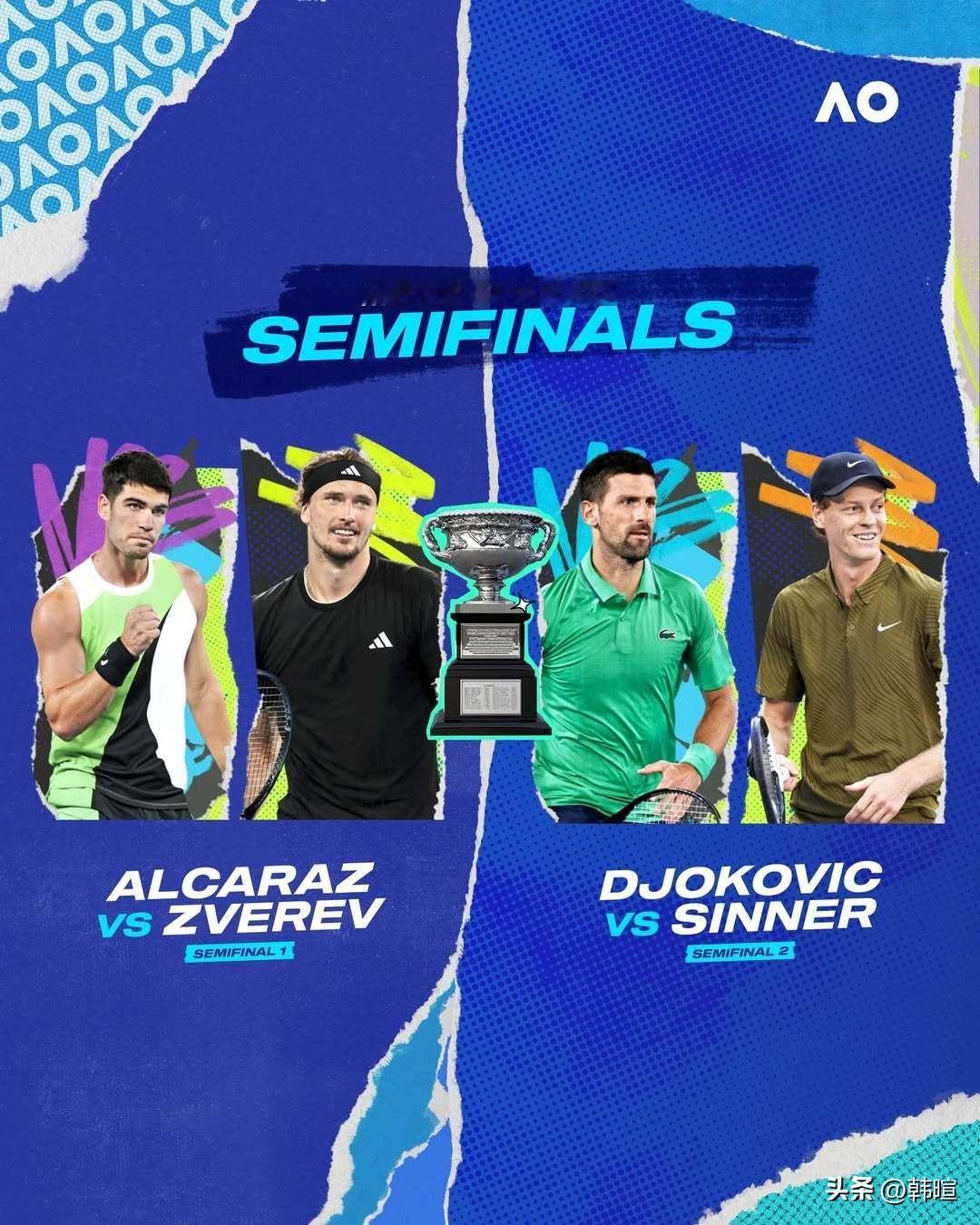 前4号种子上一次会师澳网男单4强,已经是2013年的事情,当年的4强球员分别为头号种子德约科维奇,2号种子费德勒,3号种子穆雷,4号种子费雷尔。 2013年的澳网男单半决赛:德约科维奇3-0费雷尔、穆雷3-2费德勒,穆雷和费德勒的5盘大战用时4小时06分钟。最终的男单决赛,穆雷通过抢七(7-2)拿下首盘之后,德约科维奇连扳三盘、让一追三成功夺冠! 今年的澳网男单半决赛,将是头号种子阿尔卡拉斯VS三号种子兹维列夫,二号种子辛纳VS四号种子德约科维奇。从目前各方对于这两场将于30日进行的半决赛预测来看,阿尔卡拉斯、辛纳连续四次会师大满贯男单决赛的概率无疑最大! 但是,但是,但是……真的不能是兹维列夫大战德约科维奇,最终兹维列夫成功赢得生涯首个大满贯男单冠军吗? 兹维列夫夺冠的“剧本”的确很诱人,现在就看兹维列夫究竟有没有可能接住这样的“泼天富贵”了——蒂姆一笑而过!