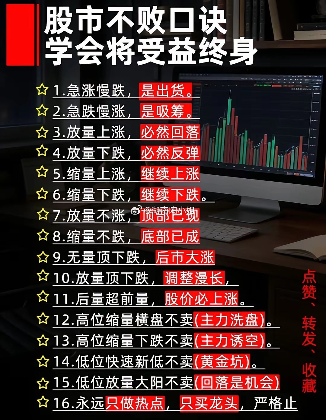 📌 这16句股市不败口诀,是老股民在实战中总结出的量价关系与行情节奏的底层逻辑。从急涨慢跌的出货信号,到缩量上涨的延续动能,再到高位洗盘与低位黄金坑的识别,它把复杂的盘口语言简化成了易懂的操作指南。记住这些规律,再结合自己的交易体系,能帮你更敏锐地读懂市场信号,在涨跌中守住节奏。各位友友们可以给我点点关注➕赞,谢谢大家的支持👏🏻👍🏻