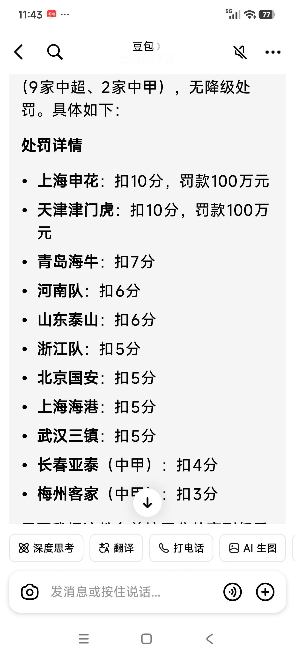 惨了!共有9家中超俱乐部和2家中甲俱乐部被罚分处罚,新赛季从负分开始,中超联赛冠军要重新洗牌了! 上海申花10分,罚款100万元。 天津津门虎10分,罚款100万元。青岛海牛7分。 河南队6分。 山东泰山队6分。 浙江俱乐部6分。 北京国安5分。 上海海港5分。 武汉三镇5分。 长春亚泰(降入中甲)4分。 梅州客家3分。