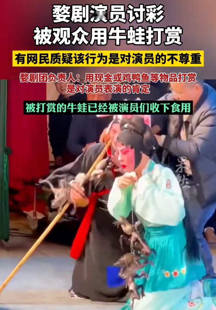 “太恶俗了!”一婺剧剧团到村里表演节目,演出结束后婺剧演员在台前讨彩,没想到,两名男子突然拿着两串牛蛙挂在演员的胸前,引起了观众一阵哄笑,但两名演员的表情却相当难看,事后剧团负责人回应:无伤大雅 视频中,当时一男一女两名演员在台前向村民们讨彩,这也是很多剧团表演结束后的固定流程,没想到,这时突然两名男子从后台走上了,一人拿着一串牛蛙强行挂在了两名演员的脖子上 两名演员瞬间脸上就出现了痛苦面具,男演员立刻就把牛蛙拿了下来,女演员因为害怕连眼睛都不敢睁开,最后还是在他人帮助下才拿下牛蛙。相比之下,后台一些观众却笑得合不拢嘴 对此,剧团负责人表示,打赏演员是对他们演出的认可和肯定,在村里很多观众都会用钱或者鸡鸭打赏,但牛蛙确实是第一次,不过无伤大雅,这些牛蛙已经被食用了 可真是无伤大雅吗?演员在台上卖力表演,不是来接受惊吓和难堪的。所谓讨彩,原本是民间演出中一种朴素的互动方式,是观众随手给出的一点心意,一块红布、几元零钱,甚至一篮土产,图的是个彩头,传递的是尊重和感谢 但把活蹦乱跳、滑腻冰凉的牛蛙直接挂到人身上,性质就变了。这不是喝彩,是捉弄;不是尊重,是冒犯 有人说乡下地方不必太较真,可乡下人最讲礼节和人情。真正懂得看戏的乡亲,不会用让人难受的方式来表达喜欢 这种举动,看似是玩笑,实则透着一股不把人当回事的轻慢。演员在台上奉献才艺,不该成为被取笑的对象 我想说的是,尊重不是什么高大上的词,说白了就是别让别人难受。喜欢热闹没问题,开玩笑也没问题,前提是对方愿意接。一旦把人当成取乐的道具,再热闹的场面,也会慢慢变冷