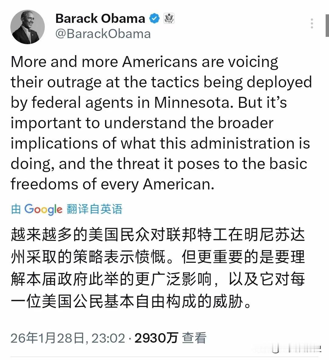 美国前总统奥巴马昨晚(北京时间1月28日晚)发文写道:“越来越多的美国民众对联邦特工在明尼苏达州采取的策略表示愤慨。但更重要的是要理解本届政府此举的更广泛影响,以及它对每一位美国公民基本自由构成的威胁。” --- 明尼苏达州冰冷的街头,三周内接连倒下了两个鲜活的生命。一位是名叫蕾恩·古德的母亲,另一位是37岁的急诊护士亚历克斯·普雷蒂。联邦特工称他们是“本土恐怖分子”,而他们的亲人邻居,只知道他们是社区里的普通人。 枪声响起的理由,官方说辞和公众看到的画面截然不同。国土安全部最初称普雷蒂持枪威胁特工,但现场视频显示他当时似乎只是举着手机拍摄。最新的官方初步报告也承认有两名特工开了枪,却对普雷蒂是否持枪威胁只字未提。真相在迷雾中摇摆。 更令人心寒的是调查的闭门羹。事件发生后,明尼苏达州自己的刑事调查人员带着法官签署的搜查令赶到现场,竟被联邦人员拒之门外。州总检察长说,这种粗暴拒绝在他职业生涯中“从未发生过”。自己人查自己人,公众的信任从何谈起? 这场风暴的中心,是超过三千名联邦移民特工涌入明尼阿波利斯和圣保罗。他们的数量,甚至超过了这两个城市所有宣誓警官的总和。城市街道变成了高度军事化的战区,普通市民的日常生活被恐惧笼罩。 联邦与州的对抗已公开白热化。司法部长向明尼苏达州开出条件:想要我们撤人,就得交出所有选民名单、福利记录,并废除庇护城市政策。州政府一口回绝,直指这是“公然胁迫”和违法。特朗普总统一边称与民主党州长“想法相近”,一边又指责枪击死亡是“民主党制造的混乱”。 两党的炮火在国会猛烈对撞。超过120名民主党议员联名要求弹劾国土安全部长。事关政府运作的拨款法案,也因为两党在移民执法资金上的死斗而岌岌可危,政府机构再次面临停摆风险。两条人命,彻底点燃了政治火药桶。 当我们谈论自由,最根本的一条是免于恐惧的自由。当一位持证护士在街头拍摄可能成为被杀的理由,当地方执法者被禁止调查发生在本地的案件,这种恐惧已经深深植根。它意味着权力可以自我定义法律,而普通人无从辩驳。 奥巴马所说的“广泛影响”,正在于此。这不仅仅是明尼苏达一个州的问题。它是一套危险先例的测试:联邦权力能否凌驾于地方自治之上?执法行动能否绕过基本问责?当政治斗争急于给死者贴上“恐怖分子”标签,我们是否已经放弃了寻求公正的耐心? 全美多地爆发的和平抗议,是公民良知最直接的表达。他们捍卫的不是某个政党,而是在捍卫一个基本原则:在这个国家,生命权与问责制必须高于政治算计和不受约束的权力。如果今天我们对发生在他街区的悲剧沉默,明天它就可能叩响我们每个人的家门。 各位读者你们怎么看?欢迎在评论区讨论。 特朗普刺杀事件 美总统奥巴马 美国总统奥巴马 美国前总统 巴拉克奥巴马 泰勒·奥巴马