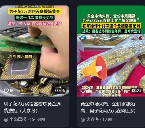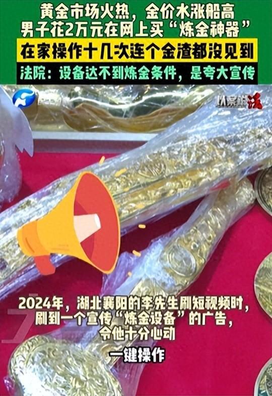 也是吃了没文化的亏!湖北襄阳,一男子看到近期金价上涨也想着赚一笔,偶然在网上看到有人在卖“炼金设备”,介绍月入50000不是梦,男子当即花两万下单,可操作了十几次,别说是金子,连个金渣都没看到。 湖北襄阳的李先生家里,前些日子大概弥漫着一股难以言说的尴尬气氛。操作台上的那些瓶瓶罐罐,被他像供财神一样小心翼翼地摆弄了十几次。为了这一堆冷冰冰的金属疙瘩,他可是真金白银掏了两万块钱出去。 当时脑子里盘算的画面太美了:这边把废旧原料扔进去,那边手指轻轻一按开关,纯金就能像变魔术一样生出来。结果呢?别说金条金元宝了,就是拿着放大镜满地找,连一颗闪光的“金渣”都没见着。这事儿怪谁?很多人第一反应是怪骗子手段高,确实,那广告打得是真精准。 它不说深奥的化学方程式,只专门挑人的软肋戳:无门槛、废料变现、月入五万。对于正看着金价K线图眼红、又苦于没有技术门路的普通人来说,这简直是量身定制的“致幻剂”。但这背后有个最朴素的逻辑硬伤,李先生当时显然是选择性失明了。 如果两万块买个傻瓜机器就能月赚五万,那卖机器的人得多大公无私,才肯把这棵摇钱树拱手让人?这哪里是买卖,分明是在做慈善。可惜,被贪念蒙住眼睛的时候,常识往往是第一个离家出走的。 在严格遵照那个所谓的“教程”操作了十几次全部归零后,李先生终于不得不承认,自己买回来的不是财富密码,而是一个笑话,法律不跟你讲玄学,它只看物理属性。当李先生一纸诉状把商家告上法庭,这层窗户纸被捅得稀碎。 法院经过审理,给出的结论极其硬核:涉案设备根本就不具备提炼黄金的技术条件。换句话说,这不仅仅是夸大宣传,这是指鹿为马,拿一堆废铁当高科技卖,纯粹的忽悠。 在法官的调解桌上,这场荒诞剧被按下了“回滚键”。那两万块钱最终是全额退回来了,李先生也把那堆破铜烂铁寄了回去。钱虽然惊险地追回来了,但这段日子的折腾、焦虑,还有那种“发财梦碎”的失落感,那是没处报销的。 在金价狂飙的背景下,想分一杯羹的人太多了。但无论市场怎么热,那个老掉牙的道理依然是铁律:凡是宣称能违背价值规律的一本万利,最后往往都得交“智商税”。真正的炼金术,从来都只藏在脚踏实地的汗水里,哪有什么一键暴富的捷径?