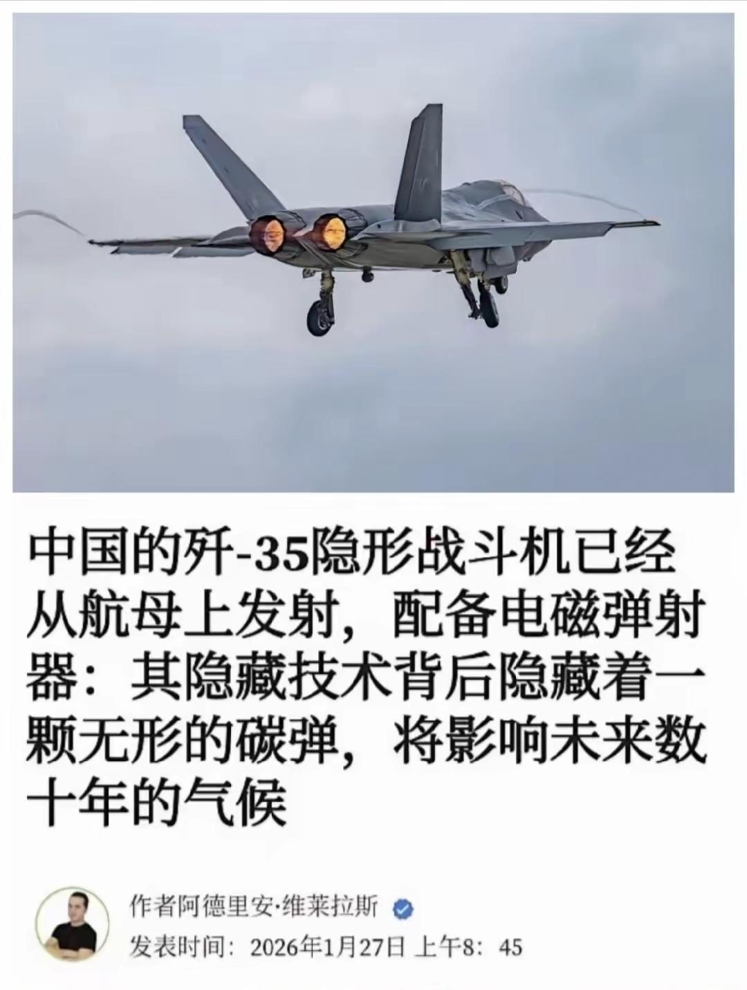 老西人称我国J35战机虽然可以从航母上电磁弹射,但这背后碳排放会“影响地球未来数十年的气候”,又是“全球变暖”呗?[捂脸] 这是要怼涡扇发动机还是电弹系统?西方发航空动机不用燃料驱动?[捂脸] 不过他们故作镇定,但心里咬牙切齿、歇斯底里又无可奈何的的样子挺好看[偷笑]