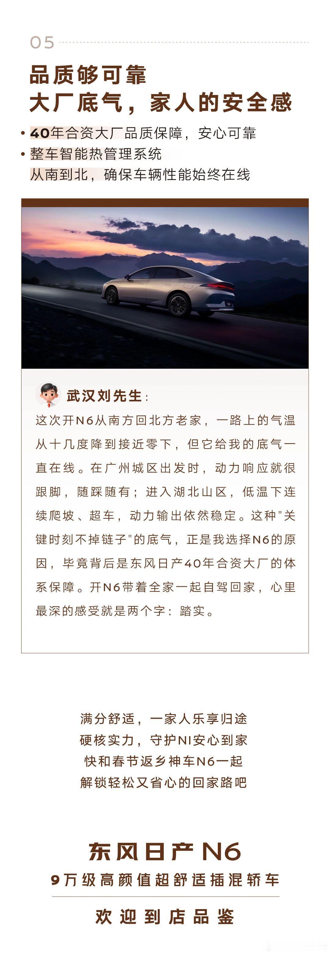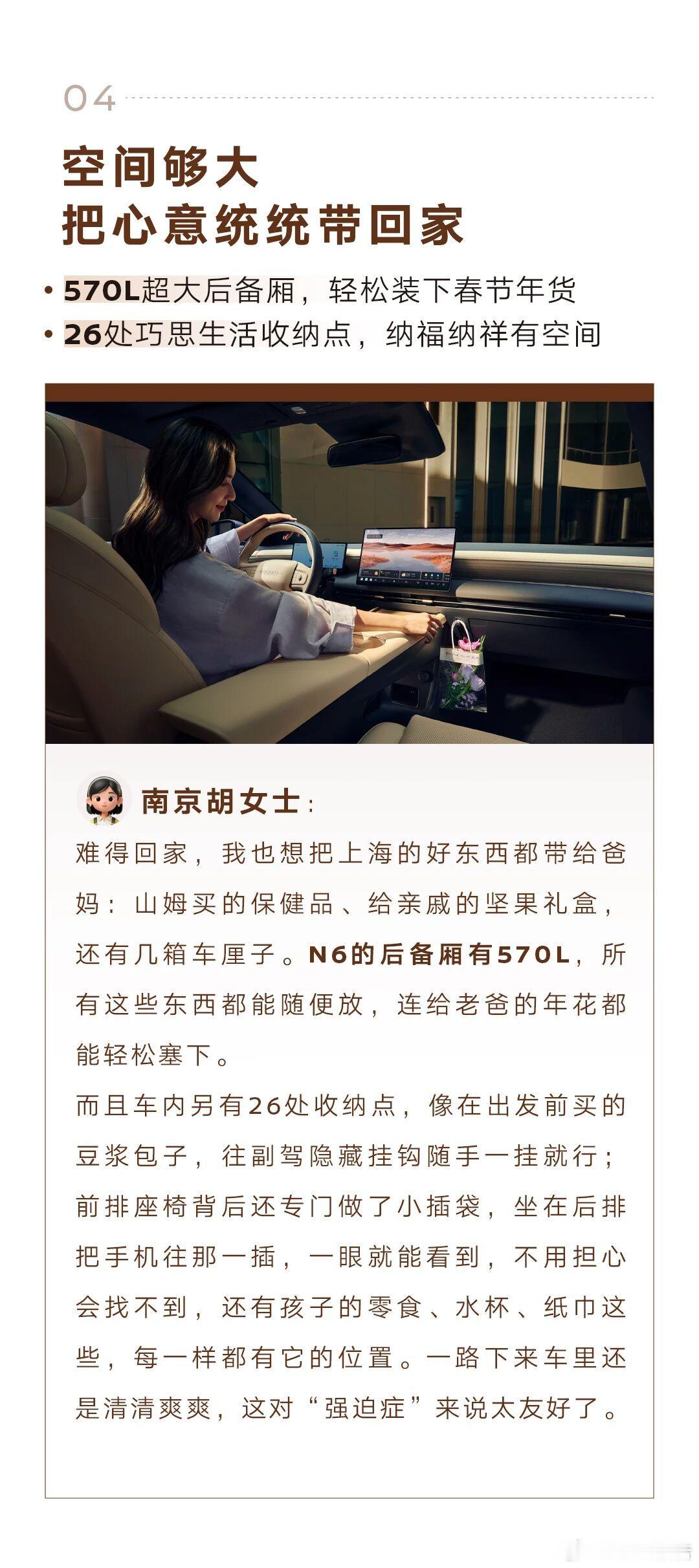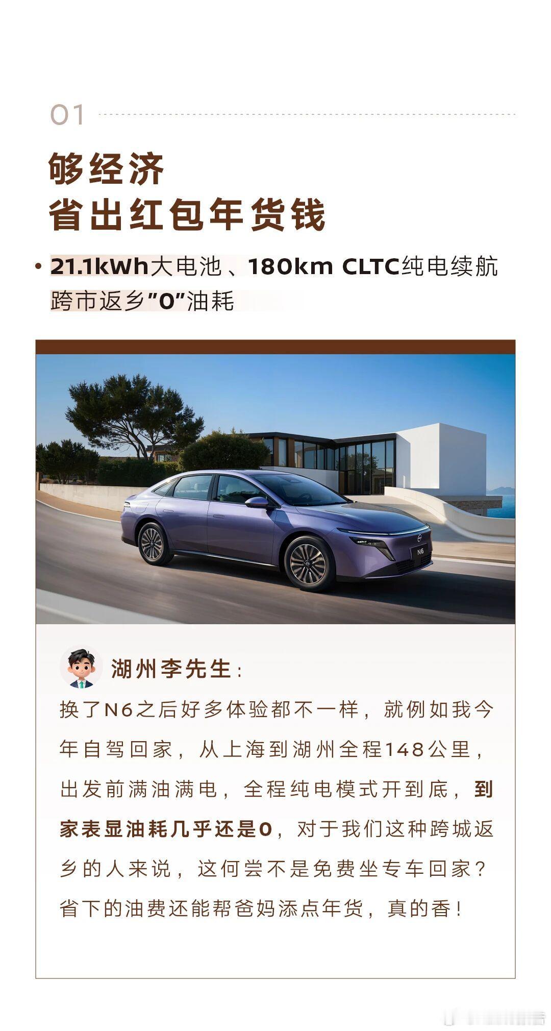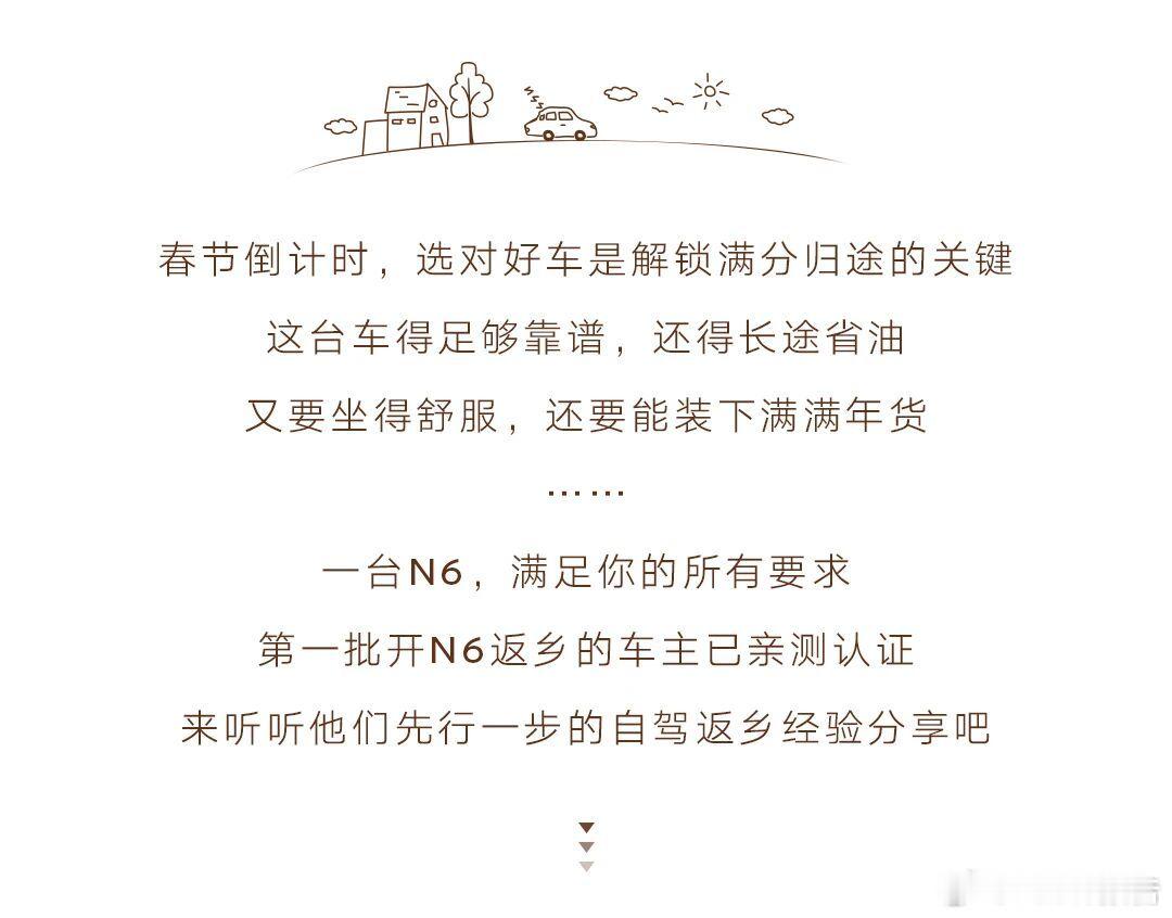 春节返乡神车N6春节返乡选车,靠谱、省油、舒适能装、大品牌缺一不可,9万级插混N6全满足。首批车主已亲测,邀你听其自驾返乡经验,助你了解归途经验。9万级高颜值超舒适插混N6新年开大紫大红大N6