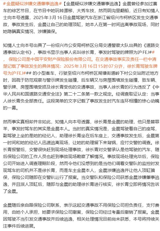 曝金晨涉嫌交通肇事逃逸金晨 交通肇事逃逸 有网友曝金晨涉嫌交通肇事逃逸:2025年3月16日金晨驾驶汽车在浙江省绍兴市柯桥区发生交通事故,事故发生后,金晨让自己的助理顶缸,她本人在第一时间逃离事故现场,同时她隐瞒真实情况,涉嫌骗保。
