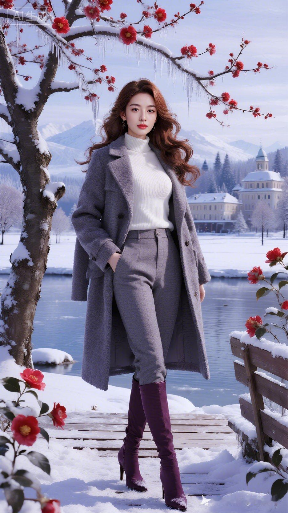 冬日雪景中的时尚穿搭,红艳花朵点缀,温暖与冷酷的完美结合。