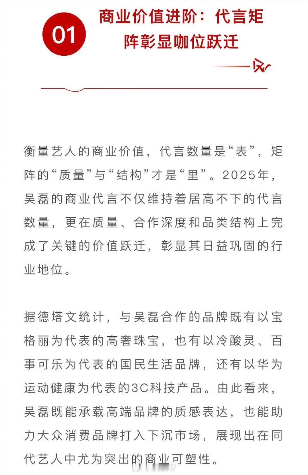 媒体评吴磊逆势爆发 吴磊的2025,是“空窗期”也是“爆发期”!没有新剧播出,却拿下11个商业合作,德塔文认证其逆势增长。这背后是他长期积累的积极国民形象和高价值受众基础在发力。“稳步上行,多维绽放”,他正走出一条独特而扎实的进阶之路。