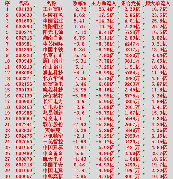 1月29日上午盘,主力趁低位,大幅买入的30名单: 蓝色光标:涨幅 +14.0%,净流入 28.3亿元 贵州茅台:涨幅 +3.56%,净流入 16.1亿元 科大讯飞:涨幅 +10.0%(涨停),净流入 15.4亿元 北方稀土:涨幅 +8.34%,净流入 13.7亿元 天孚通信:涨幅 +4.90%,净流入 10.9亿元 1月29日中午收盘,主力资金“大幅卖出”的30名单: 工业富联:跌幅 -2.72%,净流入 -23.4亿元 铜陵有色:涨幅 +8.62%,净流入 -17.5亿元 中国铝业:涨幅 +5.41%,净流入 -14.3亿元 洛阳钼业:涨幅 +1.75%,净流入 -10.7亿元 阳光电源:跌幅 -4.12%,净流入 -9.41亿元
