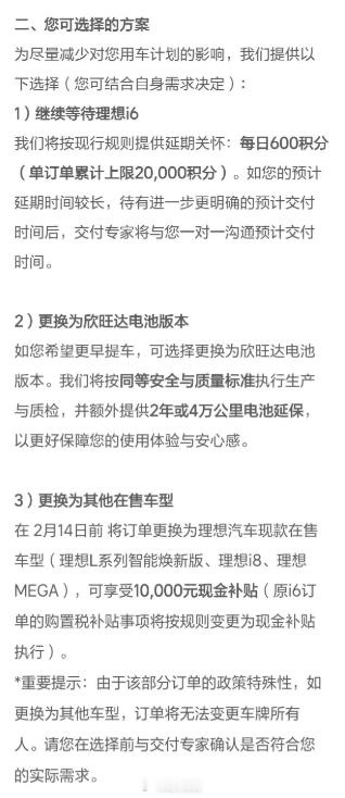 理想 i6 交付又要延期了,电池的影响太大。理想给的补偿方案:1.继续等待补偿每日 600 积分,单订单累计上限 20,000 积分。2.更换欣旺达电池,额外提供 2 年或 4 万公里电池延保。(或许是最快的提新车方法)3. 2 月 14 日前将订单更换为理想汽车现款在售车型可享受 10,000 元现金补贴。可惜很多车主们没法开新车回家过年了,本来是过年最开心的事情之一42how理想汽车理想i6